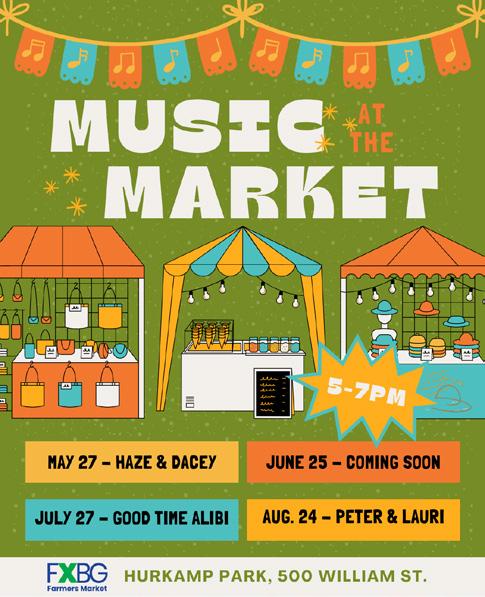 Mid-Week Farmers Market- 3-7pm, Hurkamp Park, info: fxbgfarmersmarket. com; takes place weekly through August Concert at the Market- 3-7pm, Hurkamp Park, info: fxbgfarmersmarket.com; takes place the last Wednesday of May, June, July & August