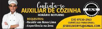 J&S Hamburgueria contrata auxiliar de cozinha Requisitos: residir em Nova Lima e experiência na área Horário: noturno Interessados encaminhar currículo para: jesdeliverys@gmail com Contato: 9 7530 2163