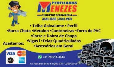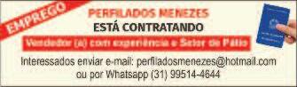 Perfilados Menezes contrata vendedor (a) e setor de pátio (Nova Lima) Requisitos: experiência na área de vendas Interessados encaminhar currículo para: perfiladosmenezes@hotmail.com ou pelo número: 9 9514 4644