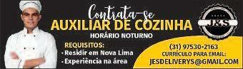 J&S Hamburgueria contrata auxiliar de cozinha. Requisitos: residir em Nova Lima e experiência na área Horário: noturno Interessados encaminhar currículo para: jesdeliverys@gmail com Contato: 9.7530 2163.