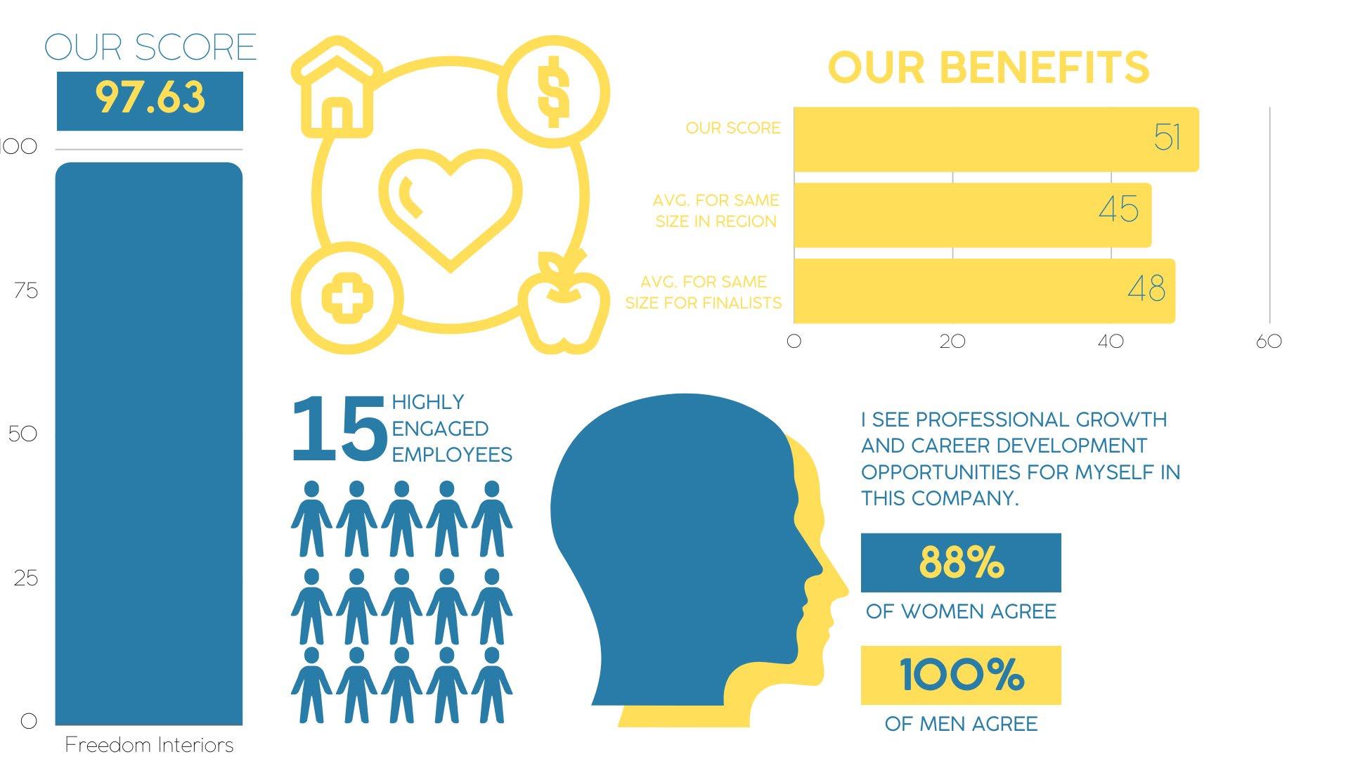Fre3dom was named to Kansas City Business Journal’s Best Places to Work in 2022. Each team member at Fre3dom Interiors particpated in an anonymous survey, conducted by Quantum Workplace, rating our company of benefit package, employee engagement, acess to learning and development and senior leadership. This is how Fre3dom stacked up.