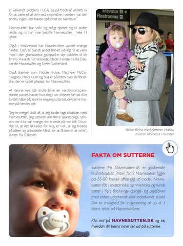 et velkendt problem i USA, og på trods af landets ry for at være et af de mest innovative i verden, var der endnu ingen, der havde opfundet en navnesut”. Navnesutten har stille og roligt spredt sig til andre lande, og nu kan man bestille Navnesutten i hele 13 lande. Også i Hollywood har Navnesutten vundet mange hjerter. Den er blandt andet blevet udvalgt til at være med i den glamourøse gavepakke, der uddeles til de Emmy Awards nominerede, såsom kvinderne fra Desperate Housewifes og Kiefer Sutherland. Også stjerner som Nicole Richie, Matthew McConaughey, Heidi Klum og Seal er på listen over de forældre, der er faldet pladask for Navnesutten. At denne nye idé skulle blive en verdensomspændende succes havde hun dog i sin vildeste fantasi ikke turdet håbe på, da ikke engang sutproducenterne troede på hendes idé. “Jeg er meget stolt af, at jeg turde tage chancen med Navnesutten. Jeg satsede alle mine sparepenge, selvom der ikke var mange, der troede på min idé. Grunden til, at det lykkedes for mig, er nok, at jeg troede på idéen og arbejdede hårdt for at få den til at virke”, slutter Pia Callesen.