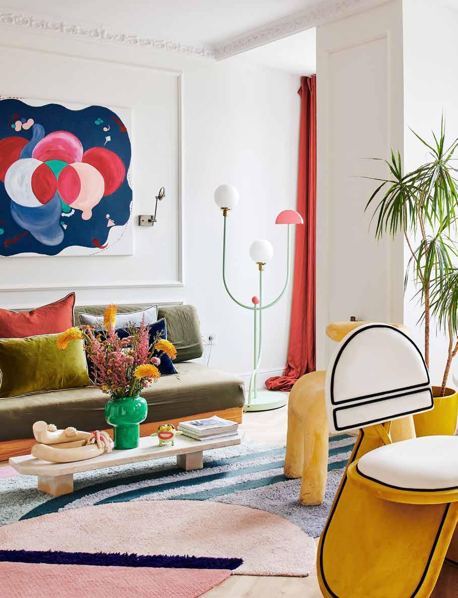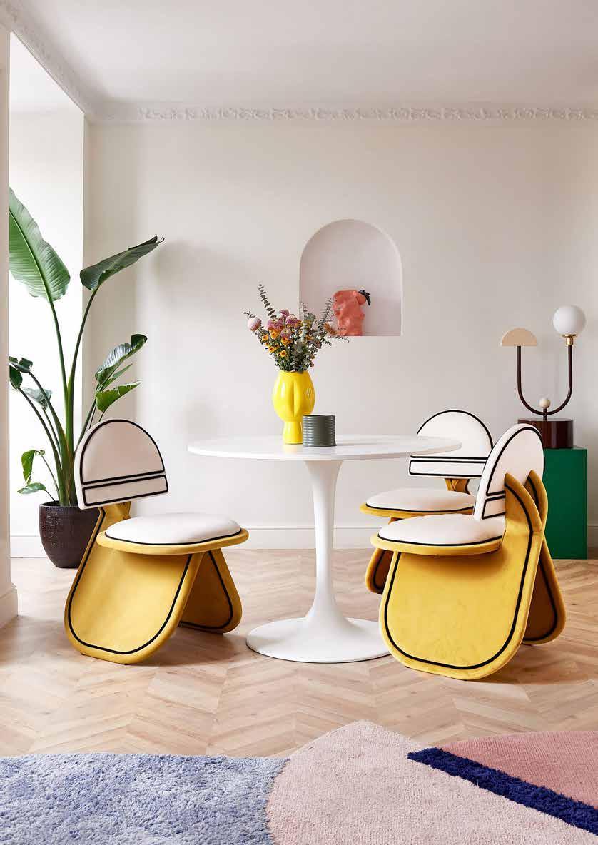 Autour d’une table vintage chinée à la Feira da Ladra, le célèbre marché aux puces de Lisbonne, des chaises Meco en velours de coton signées Dovain Studio. En arrière-plan, une lampe de table de la collection SpaceUn vase en céramique jaune d’Area côtoie une bougie Marijuana de Loewe. Dans la niche, une pièce en céramique rose d’Ana Rod. Le tout est posé sur un tapis The Blue Boy.