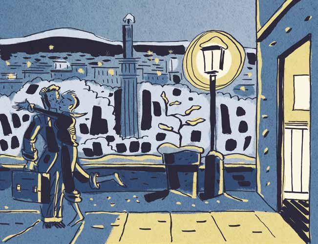 Pour cette carte blanche hivernale, Bastien Nere a glissé dans chacune de ses six illustrations un monument emblématique de notre région. Subtilement dissimulés dans les paysages enneigés, ces repères familiers ajoutent une poésie locale… et un petit jeu de piste que chacun pourra s’amuser à retrouver.