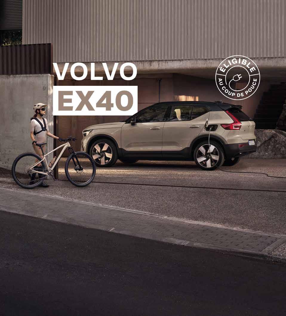(1) EX40 Single Start neuf, LLD 49 mois, 40 000 km, 1er loyer de 4 800€ ramené à 0€ après déduction de la prime CEE « Coup de pouce » de 4 800€*, sous condition de revenus, puis 48 loyers de 385€. *Montant de la Prime CEE « Coup de pouce » par Économie Énergie SAS (Détails : https://www.ecologie.gouv.fr). Réservé aux particuliers dans le réseau participant pour toute commande du 01/01 au 30/04/2026 si accord Volvo Car Finance . Détails : www.volvocars.fr. Modèle présenté : EX40 Single Plus avec options, sans apport (prime 4 800€ déduite) puis 48 loyers de 467€ .