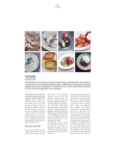 CUCÙCINA THIS SEASON, LA FOLIE DOUCE VAL D'ISÈRE IS WELCOMING A NEW RESIDENCE THAT PROMISES THE BEST OF ITALY. AT THE HELM IS FRANCESCO IBBA, A SARDINIAN CHEF, WHO UPHOLDS ITALIAN CUISINE WITH AS MUCH GENEROSITY AS FINESSE AND ALL IN THIS EXCEPTIONAL MOUNTAIN SETTING. VIVA ITALIA E BENVENUTI ALLA CUCÙCINA! "The cuisine for me is visceral, I cook what I feel and what I like, I express myself through that", confesses Francesco Ibba, the chef of Cucùcina, La Folie Douce Val d'Isère’s new warm yet, very gourmet and refined eatery. His inspirations? Whatever surrounds him at the moment, as well as his memories of childhood or happy shared moments. An inspiration dictated by the rules of his approach to products, however also by his sensitivity, Francesco Ibba combines this to refine them without ever distorting them.