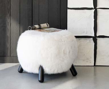 A large range of poufs and accent seats in faux fur, with wool-effect textures and recycled wood.