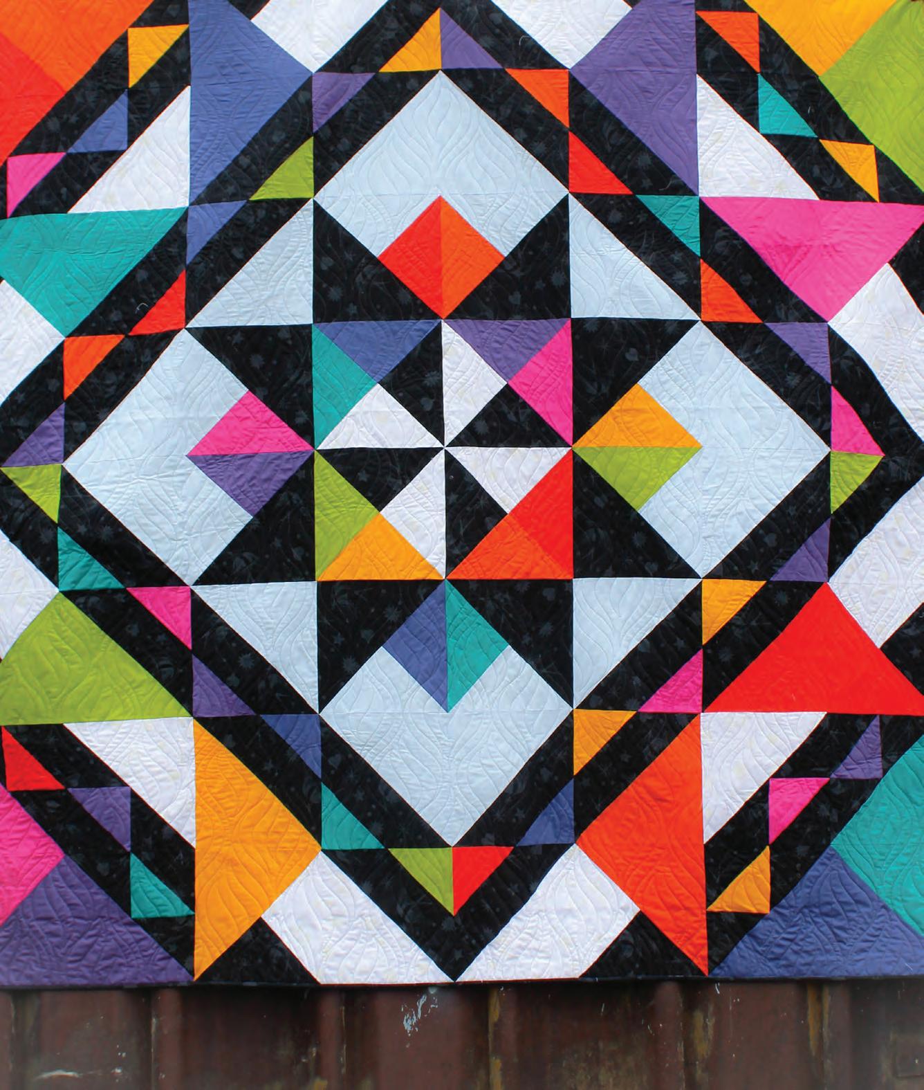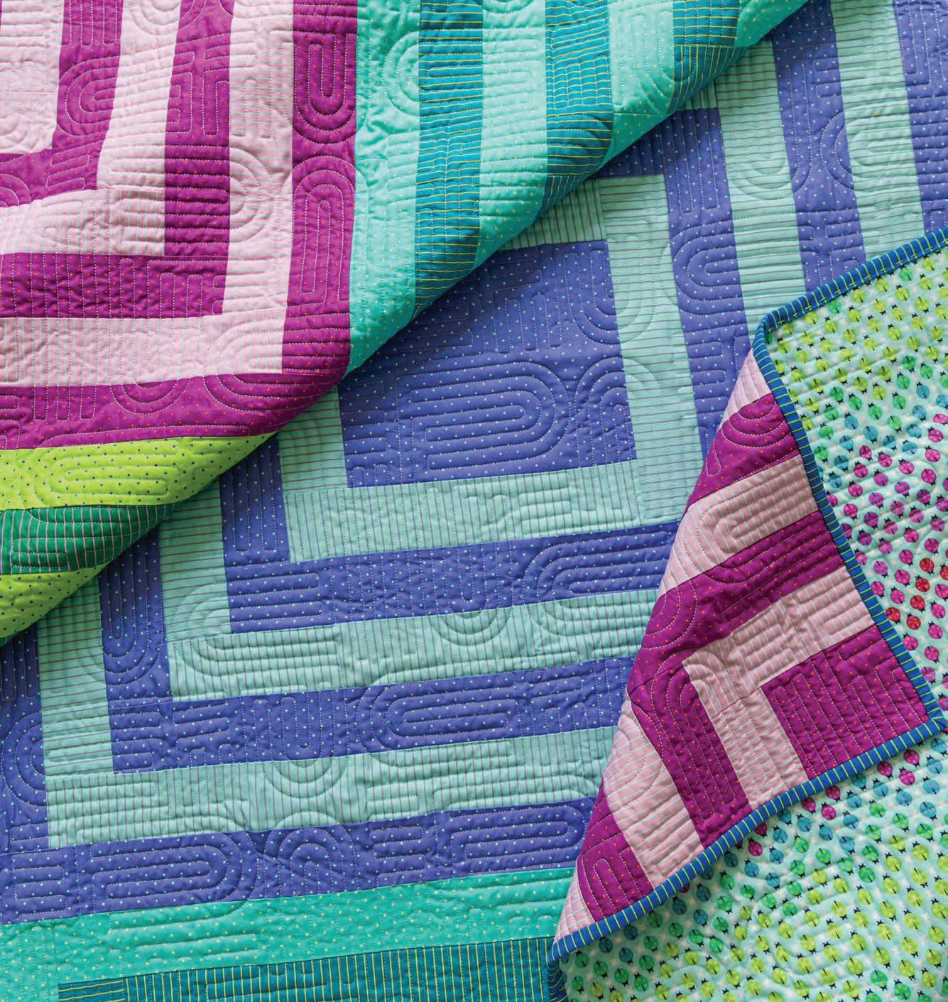 Fireside Quilt Features True Colors Tiny Dots and Tiny Stripes, Pint-Sized Prints by Tula Pink Size: 62” x 66” (1.57m x 1.68m) Designed by Suzy Quilts, @suzyquilts Pieced by Kim Vogelsang, @kimmvogel Quilted by Heather Alexander @handmade2001 Pattern available at suzyquilts.com