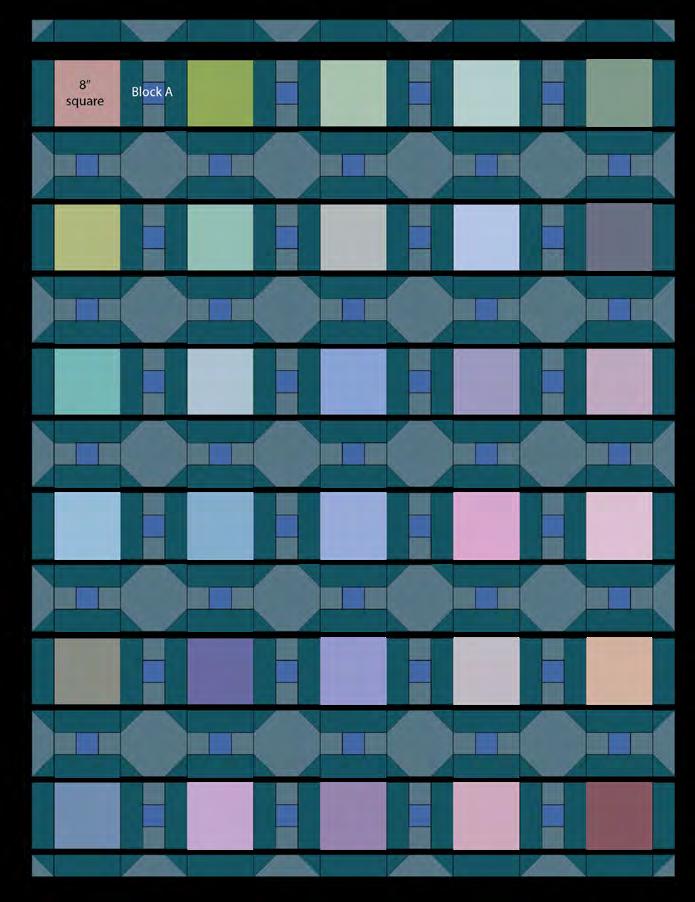 From Fabrics B–D, F, and G, cut from each: (1) 8" x 8" square, combine with Fabric A squares for a total of 30 squares