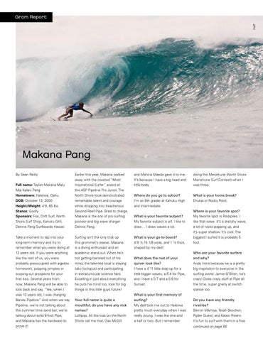 Makana Pang By Sean Reilly Full name: Taylan Makana Malu Mai Kalani Pang Hometown: Haleiwa, Oahu DOB: October 13, 2000 Height/Weight: 4’6, 65 lbs. Stance: Goofy Sponsors: Fox, Drift Surf, North Shore Surf Shop, Kahuku Grill, Dennis Pang Surfboards Hawaii Take a moment to tap into your long-term memory and try to remember what you were doing at 12 years old. If you were anything like the rest of us, you were probably preoccupied with algebra homework, popping pimples or scoping out prospects for your first kiss. Several years from now, Makana Pang will be able to look back and say, “Yea, when I was 12 years old, I was charging Banzai Pipeline.” And when we say Pipeline, we’re not talking about the summer time sand bar; we’re talking about solid 8-foot Pipe, and Makana has the hardware to prove it!