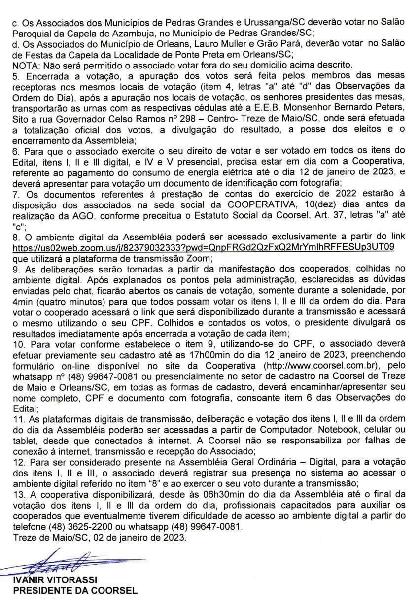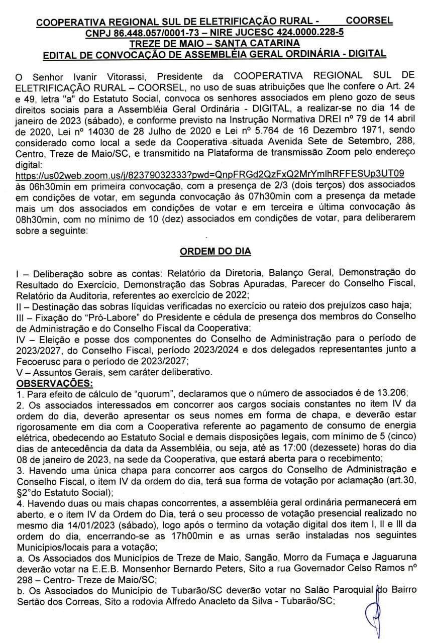 A Coorsel, por meio do presidente Ivanir Vitorassi, divulgou nesta terça-feira, dia 3, o edital de convocação para a Assembleia Geral Ordinária. Ela ocorrerá de forma digital, no sábado, dia 14, com transmissão via plataforma Zoom.