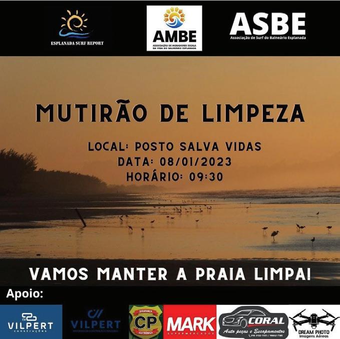 Neste próximo domingo, dia 8 de janeiro, haverá um mutirão de limpeza no Balneário Esplanada. Uma ação que é fruto da união da página Esplanada Surf Report, Associação de Moradores Escala da Vida do Balneário Esplanada e Associação de Surf do Balneário Esplanada. Fica o convite para todos participarem. Principalmente, levem as crianças para se divertirem e aprenderem mais sobre a preservação das nossas praias e natureza.