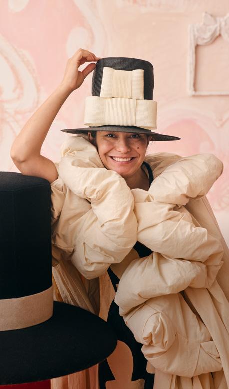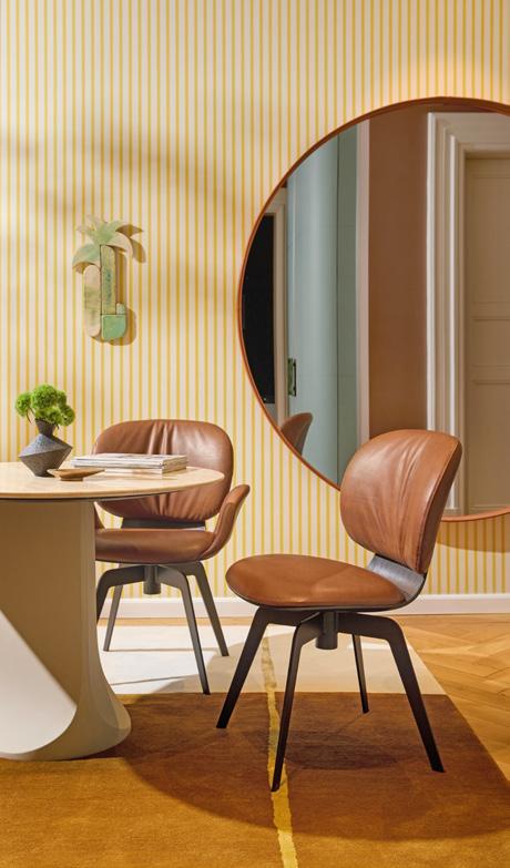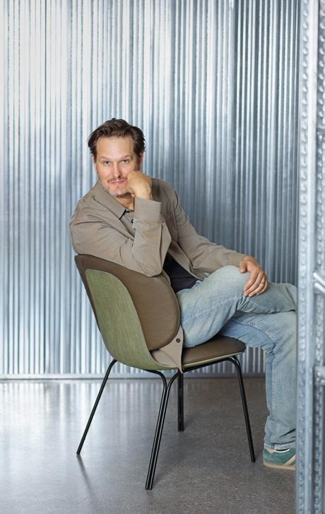 Der Designer SEBASTIAN HERKNER auf seinem dritten Stuhl für Freifrau: Vor IVY entwarf er die Kollektionen ONA und THEIA Designer SEBASTIAN HERKNER on his third chair for Freifrau: prior to IVY, he designed the ONA and THEIA collections.