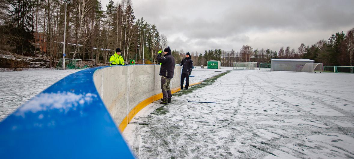 Ahvenisjärven kenttiä laite taan talvikuntoon. Vielä tänä talvena kentille jäädytetään luonnonjää, mutta ensi talve na kenttien pintaa komistaa tekojää. Luonnonjää jäädyte tään heti, kun elohopea tip puu tarpeeksi alas.