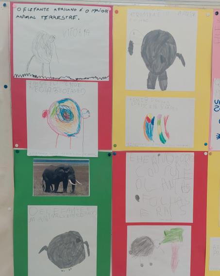 Na sala 1 fizemos um projeto sobre os elefantes e aprendemos: o elefante africano é o maior animal terrestre, pode medir 3,5m de altura e 7m de comprimento. São mamíferos e herbívoros. A tromba é o nariz e o lábio superior. Tem 28 dentes durante a sua vida e dois são as presas, que crescem sempre. Fizemos também muitos trabalhos de expressão plástica.