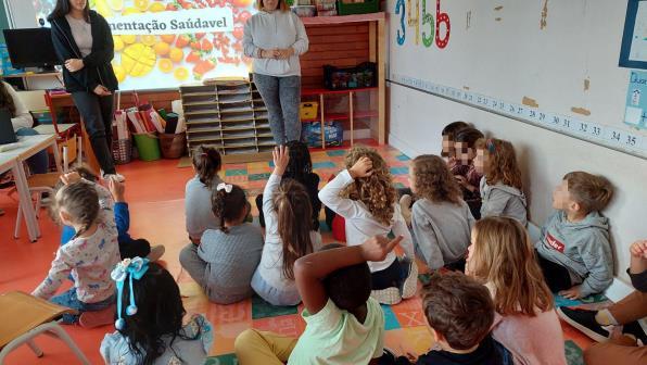 Por ocasião do Dia da Alimentação, algumas alunas do curso de auxiliar de saúde da E.S. D. Pedro V, vieram às salas do JI falar sobre a alimentação saudável e fazer espetadas de frutas.