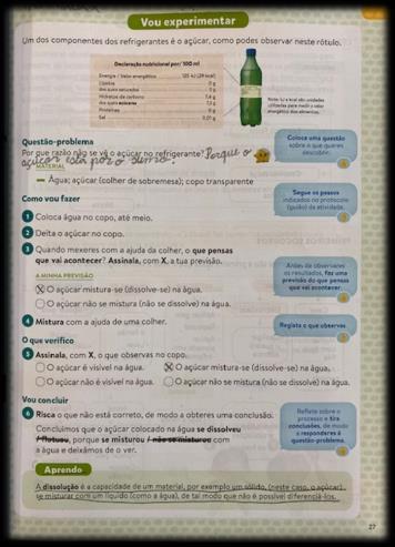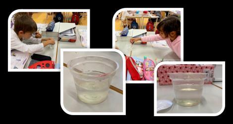A nossa turma fez uma experiência: “dissolve/não dissolve”. Experimentámos com açúcar. Descobrimos que se dissolve (mistura) com a água. Deixa de se ver, mas está lá. Outros materiais que se dissolvem na água: sal, chocolate em pó e farinha. Exemplos de materiais que não se dissolvem na água: madeira, borracha e areia.