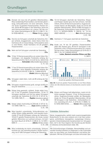 25b. Mehr als fünf Schuppen unterhalb der Seitenlinie .......................................................................... 27a. 26a. 10 bis 13 Kiemenreusenzähne am ersten linken Kiemenbogen, mit doppelter Punktreihe entlang der Seitenlinie [A 3/12–15(17); D 2–3/7–8; Sc. 9/44–51/4] ....................... Schneider (Alburnoides bipunctatus) S. 77, 122 26b. 17 bis 22 Kiemenreusenzähne am ersten linken Kiemenbogen, ohne doppelte Punktreihe entlang der Seitenlinie [A 3/16–20; D 3/8; Sc. 7–9/46–52/3–4] ....................................... Ukelei (Alburnus alburnus) S. 77, 124 27a. Schuppen relativ klein, mehr als 65 entlang der Seitenlinie .............................................................. 28a. 27b. Schuppen vergleichsweise groß, weniger als 65 entlang der Seitenlinie ........................................... 29a. 28a. Körper lang gestreckt, schlank, Anale relativ kurz, mit 12 bis 15 geteilten Flossenstrahlen, 10 bis 12 Schuppen oberhalb und fünf bis sieben Schuppen unterhalb der Seitenlinie [A 3/12–15; D 3/7–9; Sc. 10–12/65–74/5–7] ........... Rapfen (Leuciscus aspius) S. 78, 180 28b. Körper relativ hochrückig [A 3/33–44; D 3/7–9; Sc. 13–15/65–73/8–11] ............. Zope (Ballerus ballerus) S. 81, 164 29a. Maul deutlich unterständig, Schlundknochen einreihig, Körper mäßig gestreckt, nicht deutlich hochrückig, 57 bis 63 Schuppen entlang der Seitenlinie, 18 bis 21 geteilte Flossenstrahlen der Anale; dunkel gefärbt, Männchen zur Laichzeit schwarz, mit kräftig rotem Bauch [A 3/18–21; D 3/8–9; Sc. 9–10/57– 63/6–7] .................................. Zährte (Vimba vimba) S. 81, 208 29b. Maul endständig bis leicht unterständig, Schlundknochen ein- bis zweireihig bezahnt, Körper hochrückig, bis 57 (60) Schuppen entlang der Seitenlinie .......................................................................... 30a.