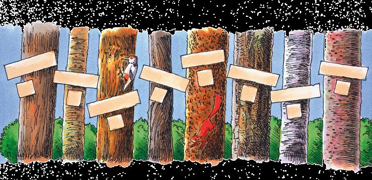 Ordne die Blätter den Bäumen zu. Zu jedem der acht Bäume gehört eines der Blätter. Notiere die entsprechenden Buchstaben in die Kästchen am Baumstamm.