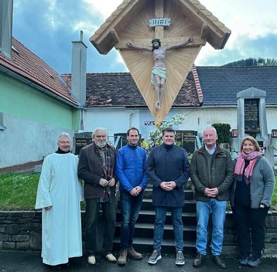 Am 11. Dezember 2023 um 8 Uhr wurde das Holz, unter Berücksichtigung der richtigen Mondphase, im Wald der Fam. Hirn vlg. Galler geschlägert. Nachdem das Holz richtig getrocknet war, begann Christian Hussauf mit seiner Arbeit und gestaltete in unzähligen Stunden das neue Friedhofskreuz. Da auch der Korpus von der Witterung schon sehr in Mitleidenschaft gezogen wurde, beschloss der Pfarrgemeinderat diesen restaurieren zu lassen. Am Freitag, dem 11. April, wurde beim Glockenklang am Abend das alte Friedhofkreuz entfernt und am Samstag, dem 12. April, das neue Kreuz zu Mittag von Christian Hussauf und Clemens Gruber aufgestellt. Am Karfreitag wurde das neue Kreuz nach der Karfreitagsliturgie feierlich gesegnet. Musikalisch umrahmt wurde die Feier vom Kirchenchor. Das neue Kreuz ist für alle, die vorübergehen, ein Blickfang und lädt zum Innehalten und einem kurzen Gebet ein.