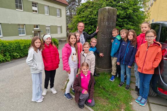 Zum zweiten Mal in diesem Jahr besuchte uns Mag. Hans Jürgen Rabko, um mit uns in die Geschichte von Kraubath einzutauchen. Diesmal machten wir uns auf den Weg, der uns vom Marktgemeindeamt, dem ältesten urkundlich genannten Gebäude Kraubaths, über die Georgikirche zum römischen Grabstein in einer Hausmauer und zu einem Postmeilenstein aus dem Jahre 1838 führte. An jeder Station gab es interessante Geschichten von damals zu erfahren. Die Kinder wurden dadurch motiviert, in der Kraubather Ortschronik nachzuschlagen und ihr Wissen zu vertiefen.