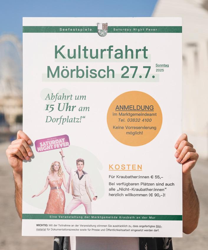 Information für alle Veranstaltungen: Kraubather Gemeindebürger:innen werden auswärtigen Teilnehmer:innen vorgezogen. Nähere Information erhalten Sie im Marktgemeindeamt. Danke für Ihr Verständnis!