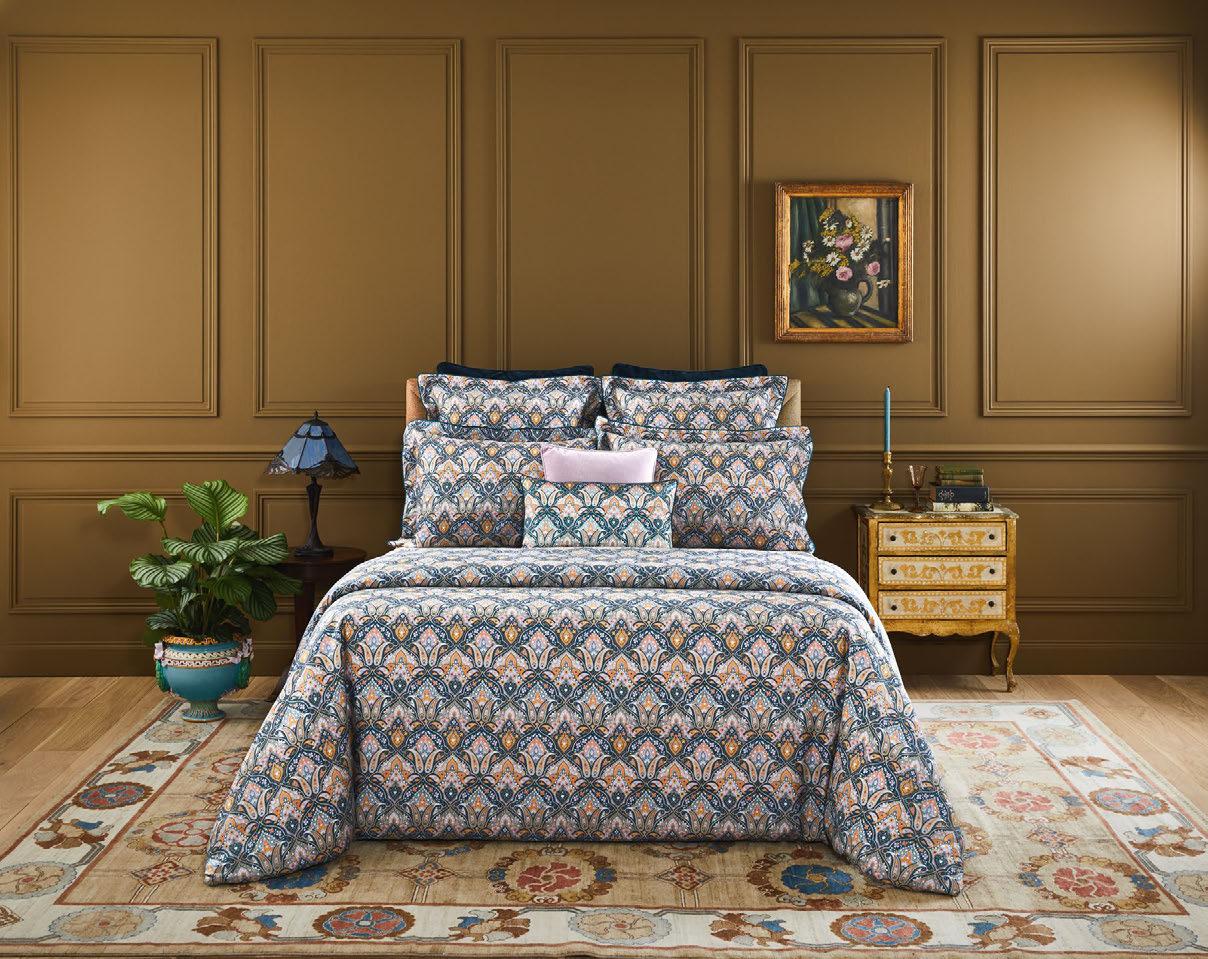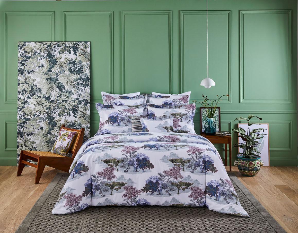 Printed, 11 colors for main design, color for coordinated design. Reversible duvet cover.