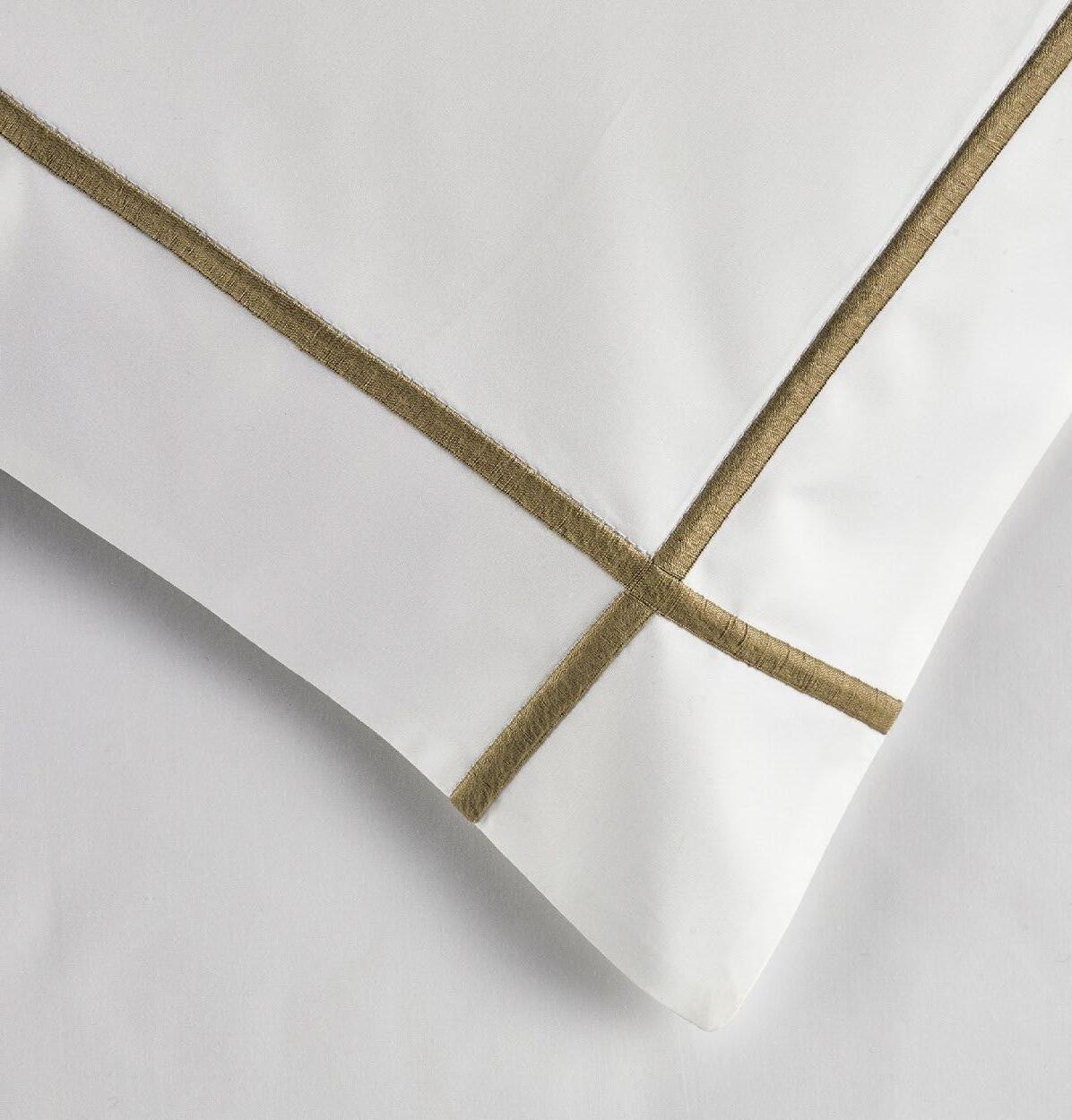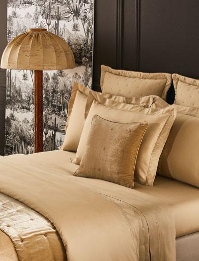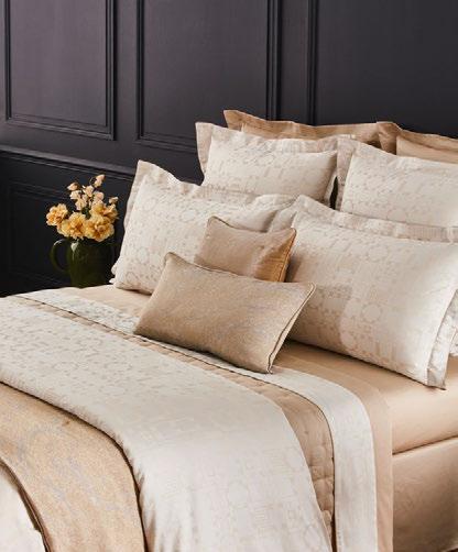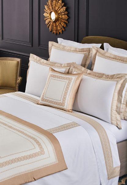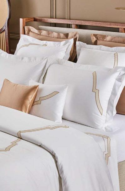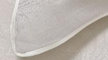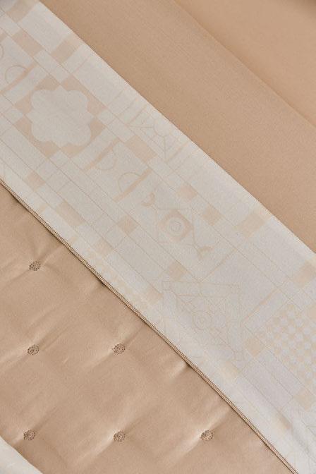 Housse de couette, face dans le tissu damassé et dos uni coloris Dune, fermeture boutons. Drap plat coloris Dune avec parement double de 13 cm dans le damassé et finition passepoil satiné rayé. Drap housse uni Dune. Taies réversibles avec volant de 5 cm et finition passepoil satiné rayé. Duvet cover in Jacquard fabric for front side and plain dyed fabric in Dune for reverse, button finish. Flat sheet in Dune plain colour with 5’’ hem in damask fabric finished with striped sateen piping. Plain dyed fitted sheet in Dune. Reversible pillow case with 2" flounce and striped piping finish.