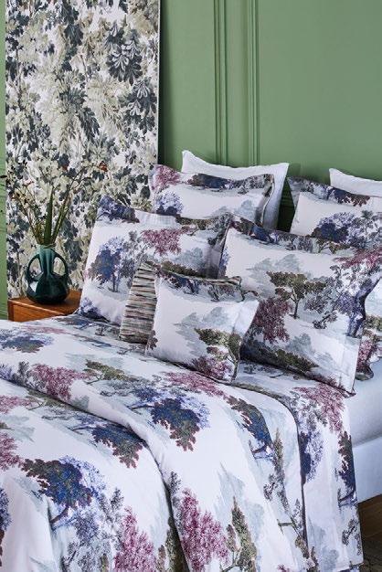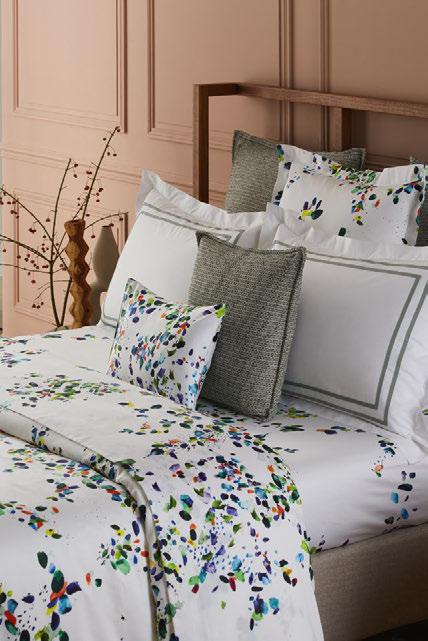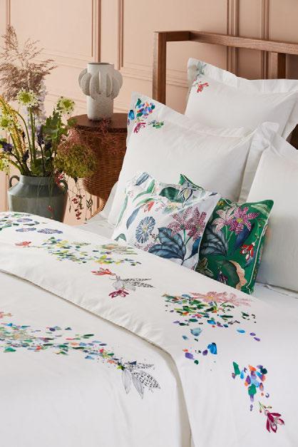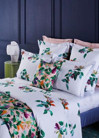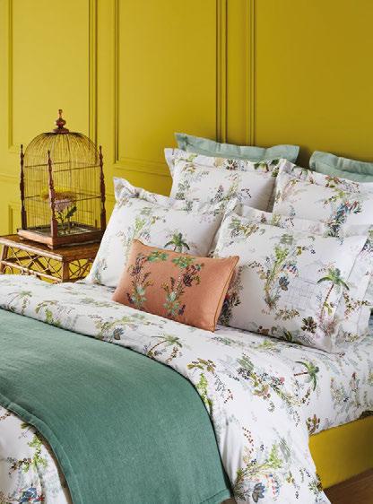 Imprimé, 7 couleurs pour le motif principal, 1 couleurs pour le motif coordonné. Housse de couette réversible, fermeture bouteille. Drap plat avec ourlet de 7 cm. Finition point fantaisie. Drap housse dans la réversibilité du modèle. Taies réversibles avec volant de 5 cm et finition point fantaisie.