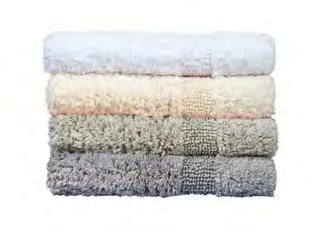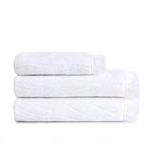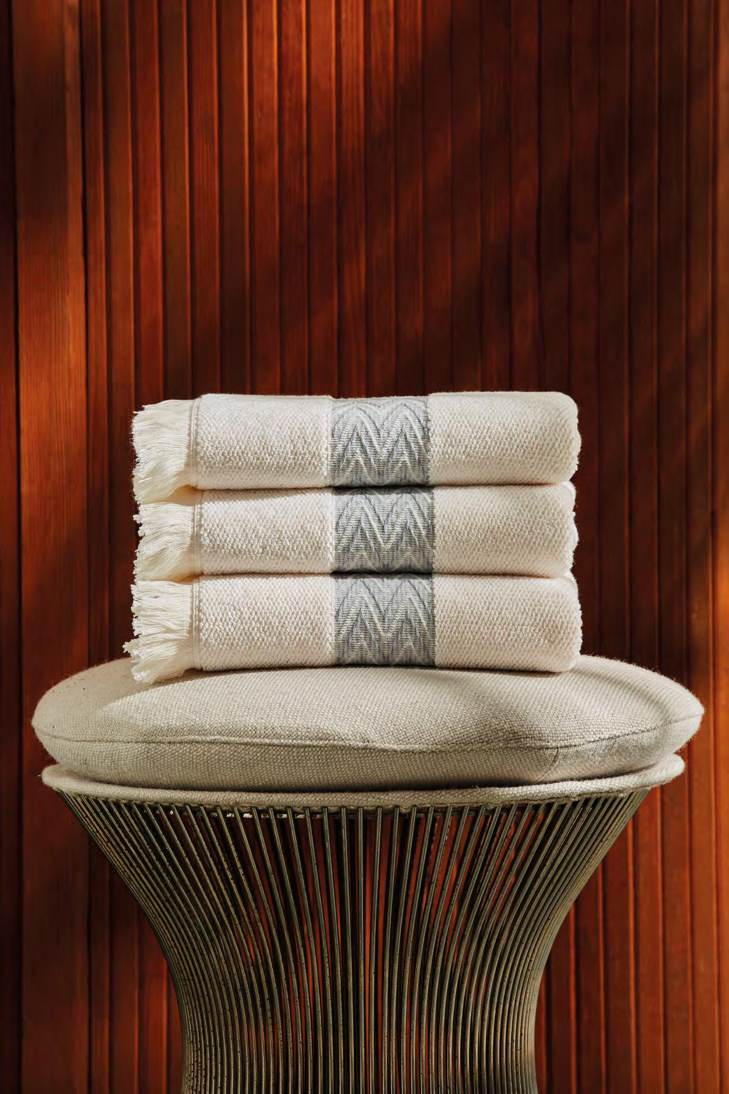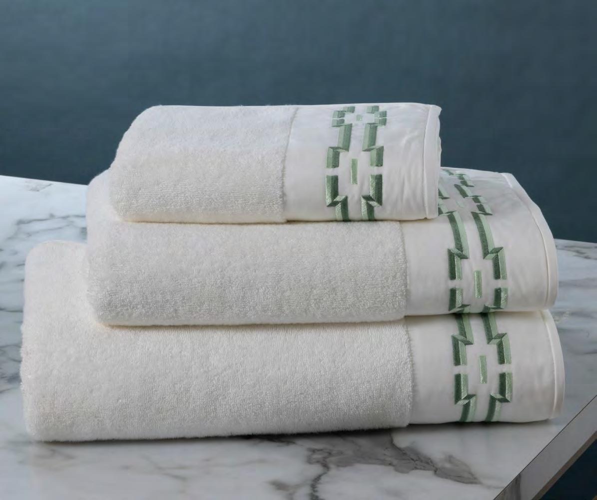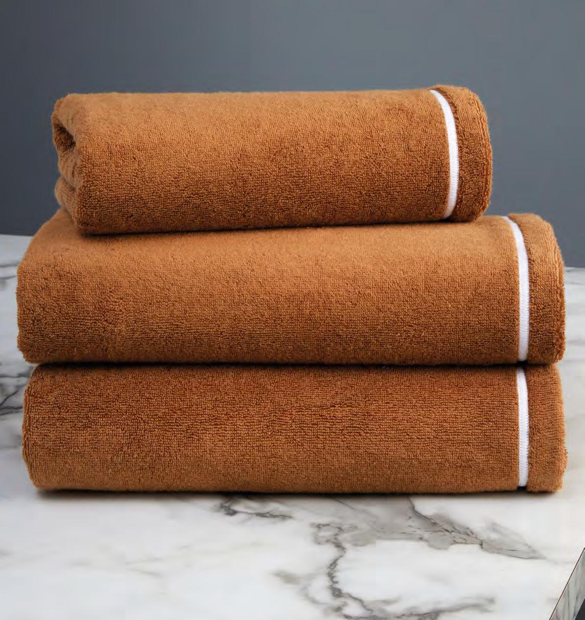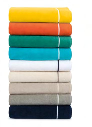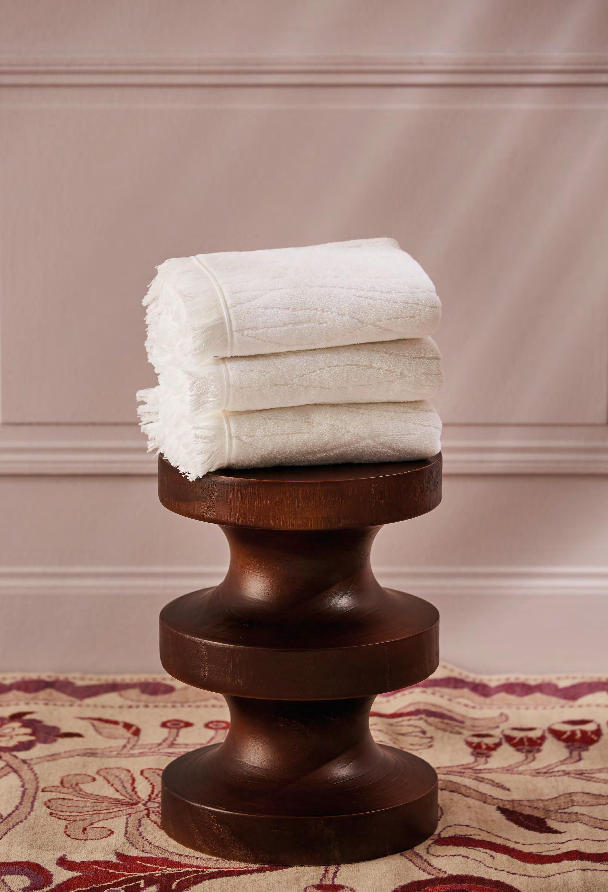 2. Bain Bath Drap de bain 90 × 150 cm, Bath Sheet 35” × 59”, Serviette de douche 70 × 140 cm, Bath Towel 28” × 55”, Serviette 55 × 100 cm, Hand Towel * 22” × 39” , Serviette invité 42 × 70 cm, Guest Towel 17” × 28”. Jacquard bicolore, finition liteau 3 cm haut et bas Passages de fins liteaux colorés.