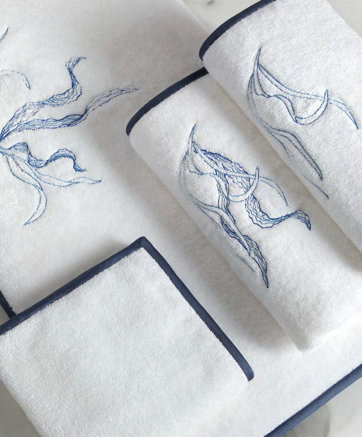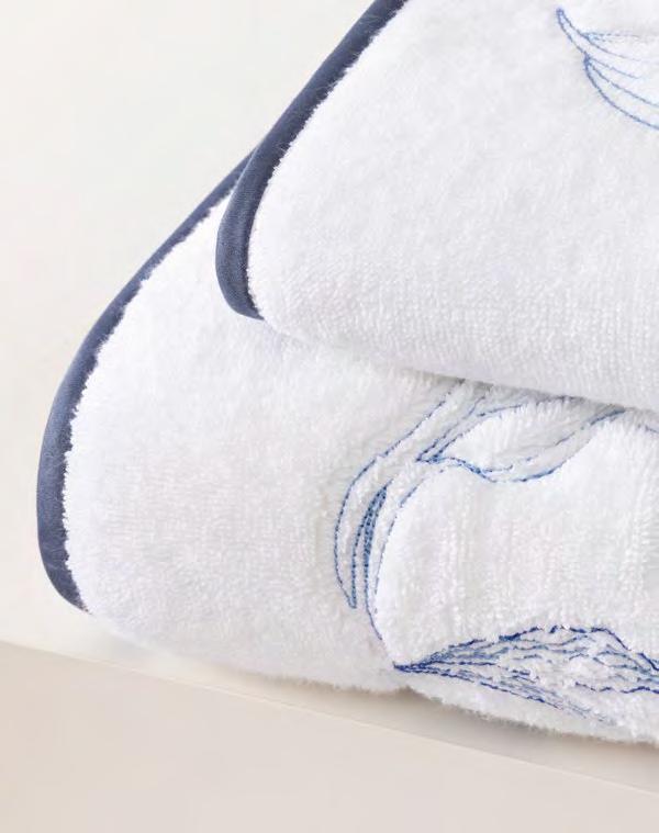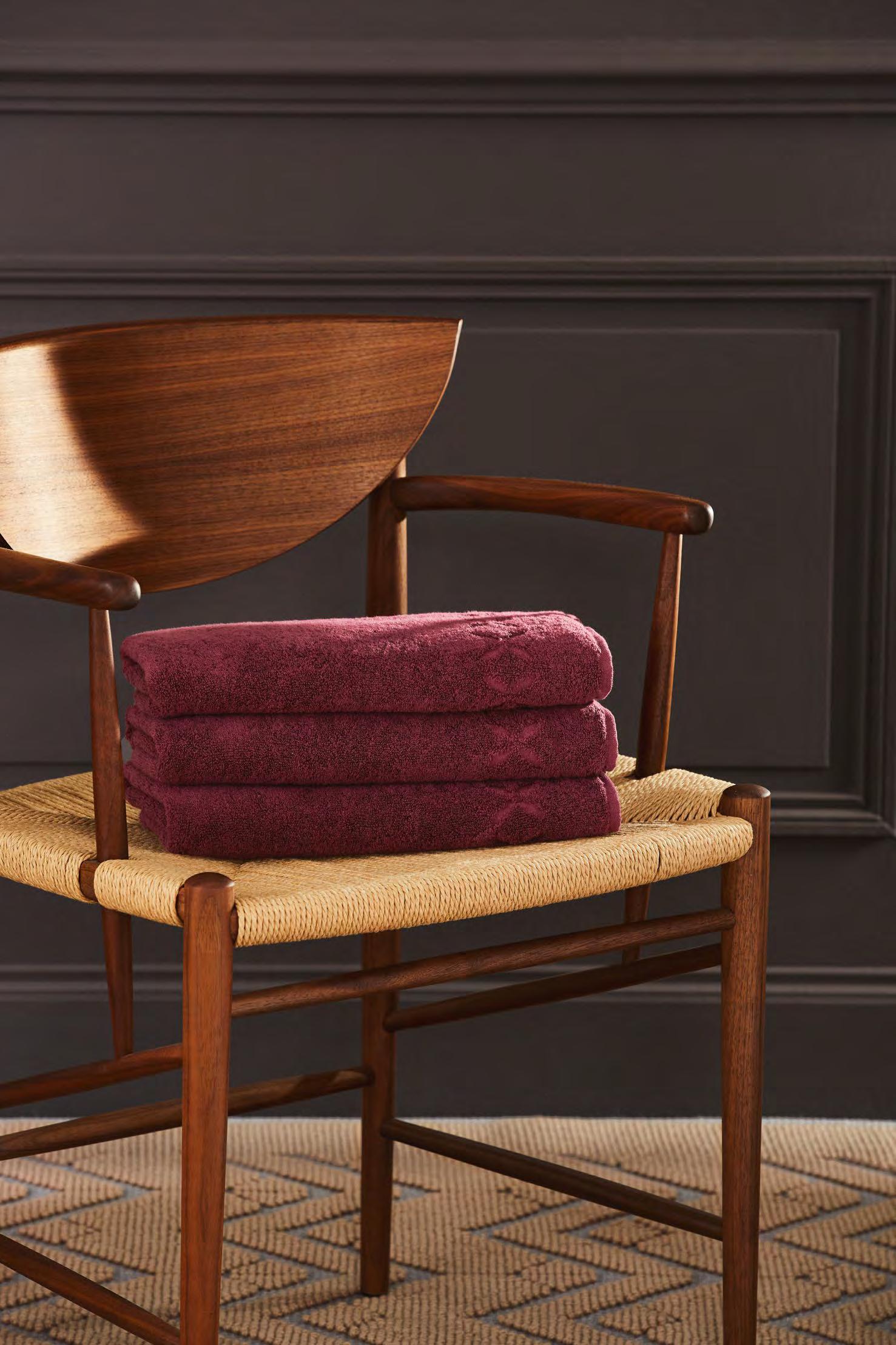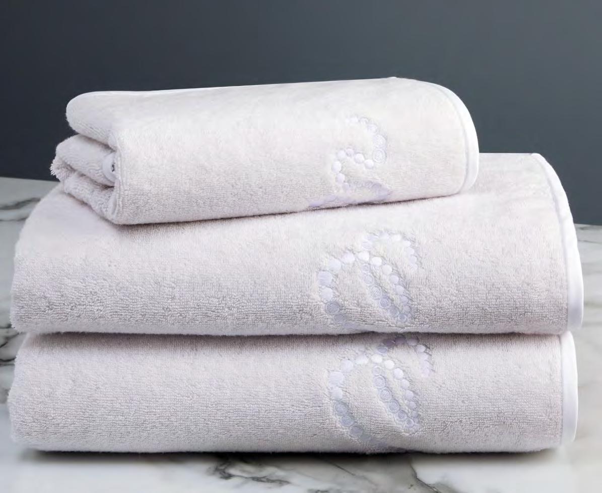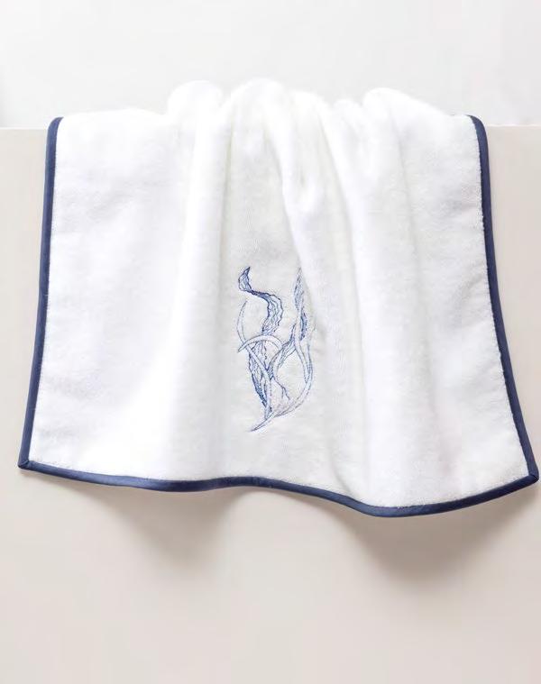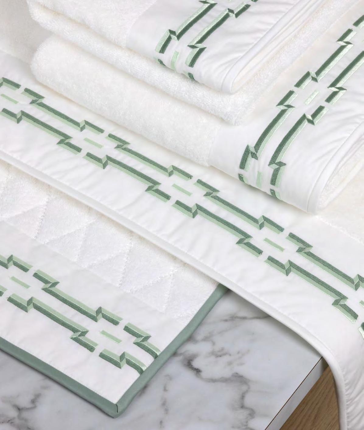 2. Bain Bath Drap de bain 90 × 150 cm, Bath Sheet 35” × 59”, Serviette de douche 70 × 140 cm, Bath Towel 28” × 55”, Serviette 55 × 100 cm, Hand Towel * 22” × 39” , Serviette invité 42 × 70 cm, Guest Towel 17” × 28”. Jacquard bicolore, finition liteau 3 cm haut et bas Passages de fins liteaux colorés.