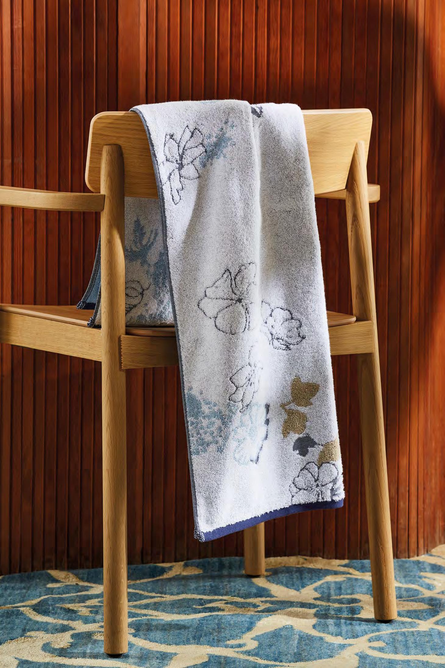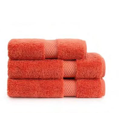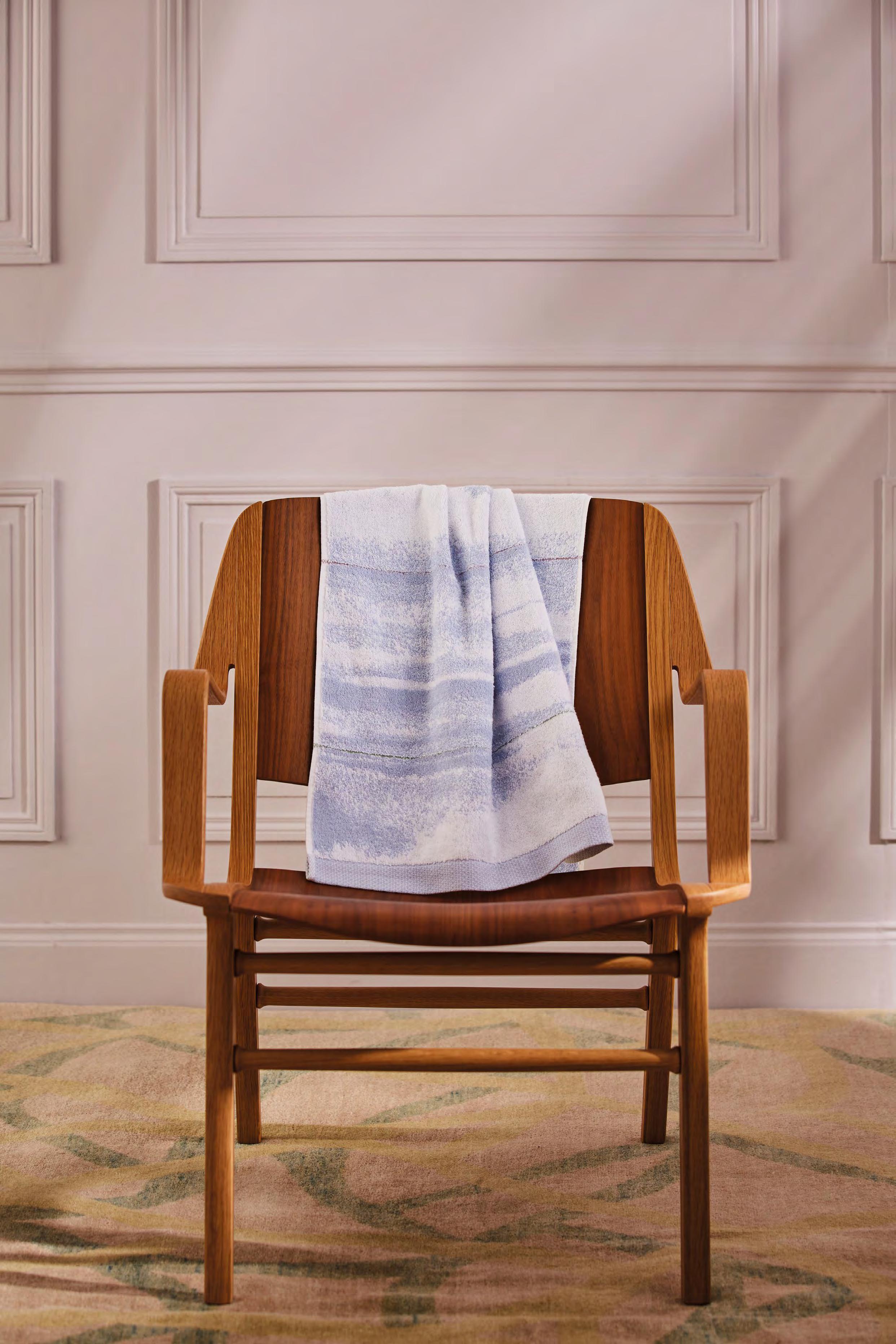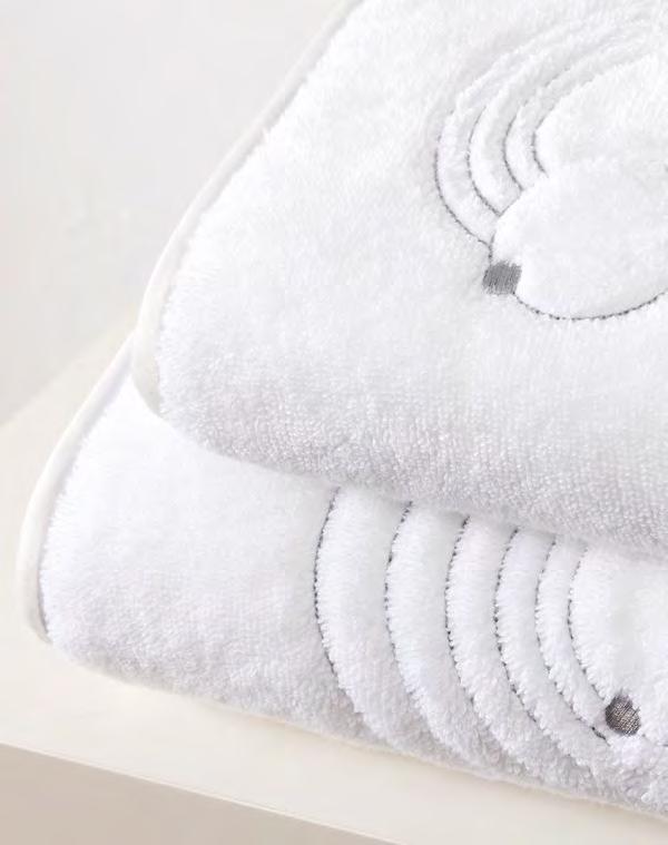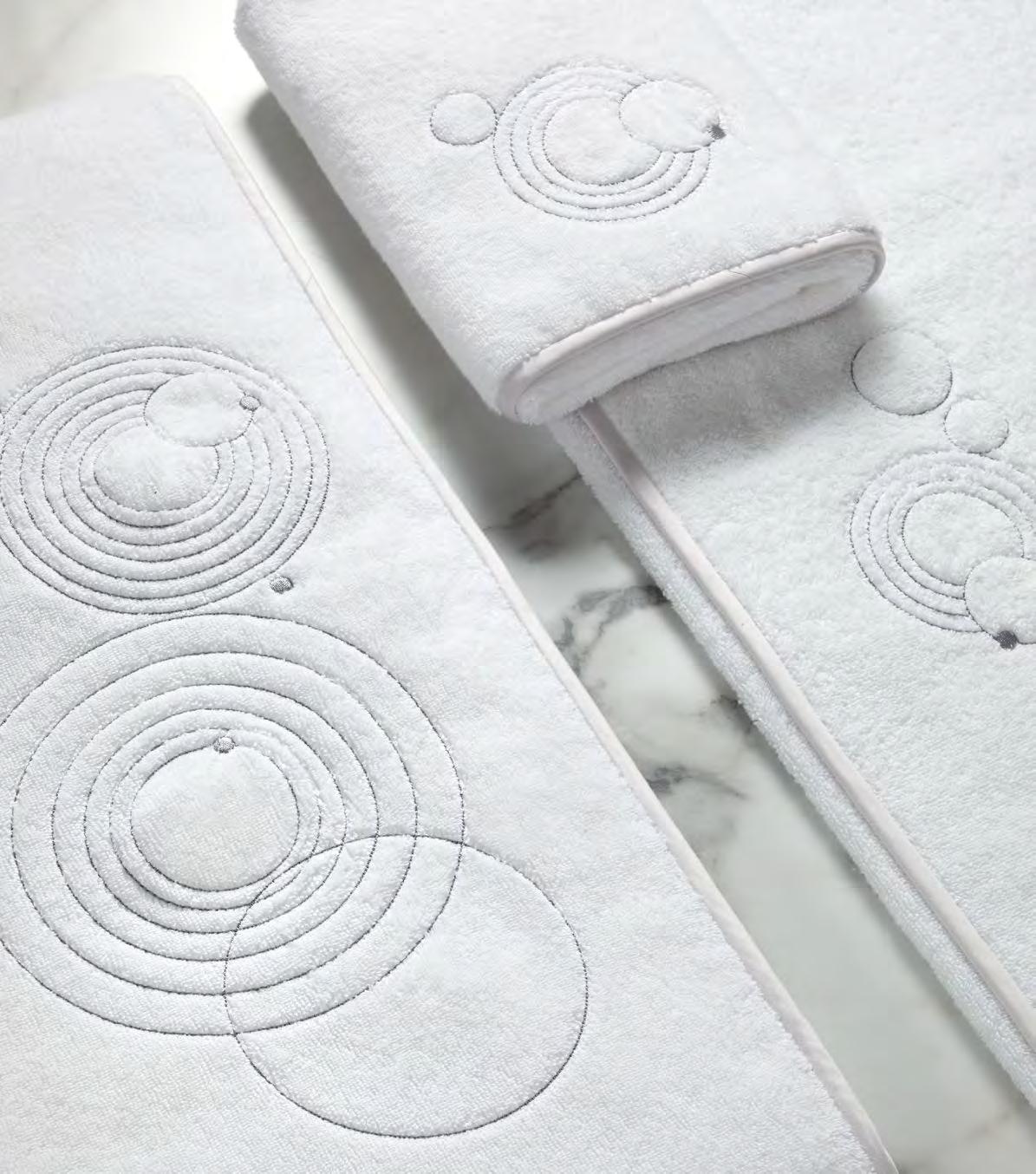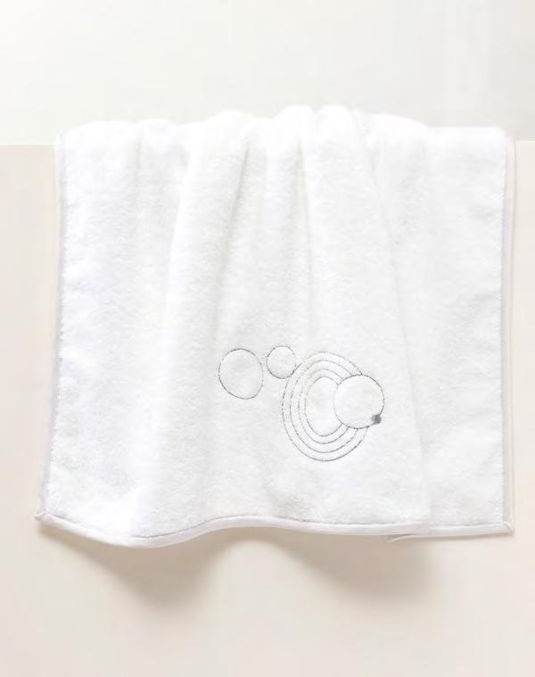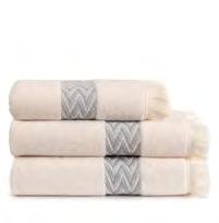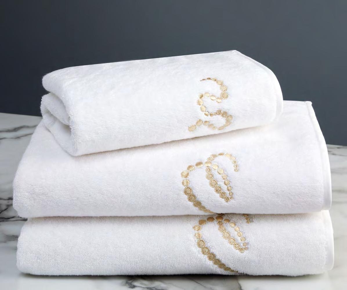 2. Bain Bath Drap de bain 90 × 150 cm, Bath Sheet 35” × 59”, Serviette de douche 70 × 140 cm, Bath Towel 28” × 55”, Serviette 55 × 100 cm, Hand Towel * 22” × 39” , Serviette invité 42 × 70 cm, Guest Towel 17” × 28”. Jacquard bicolore, finition liteau 3 cm haut et bas Passages de fins liteaux colorés.