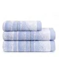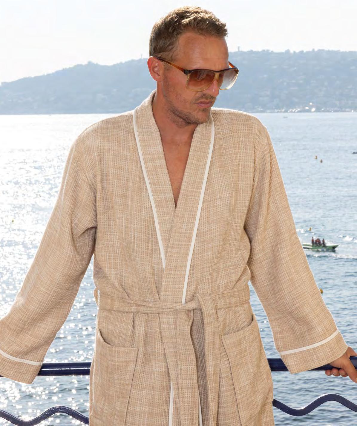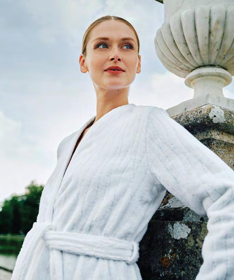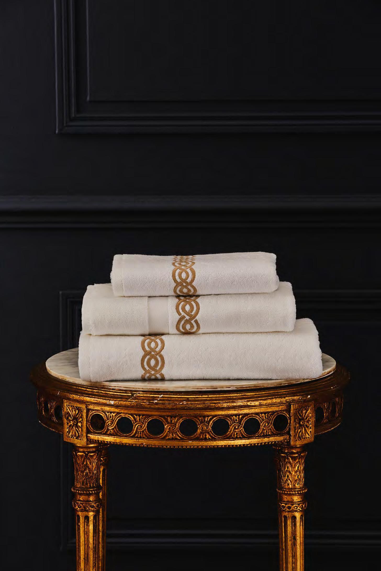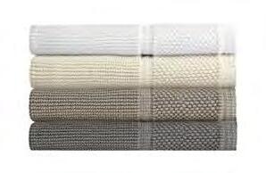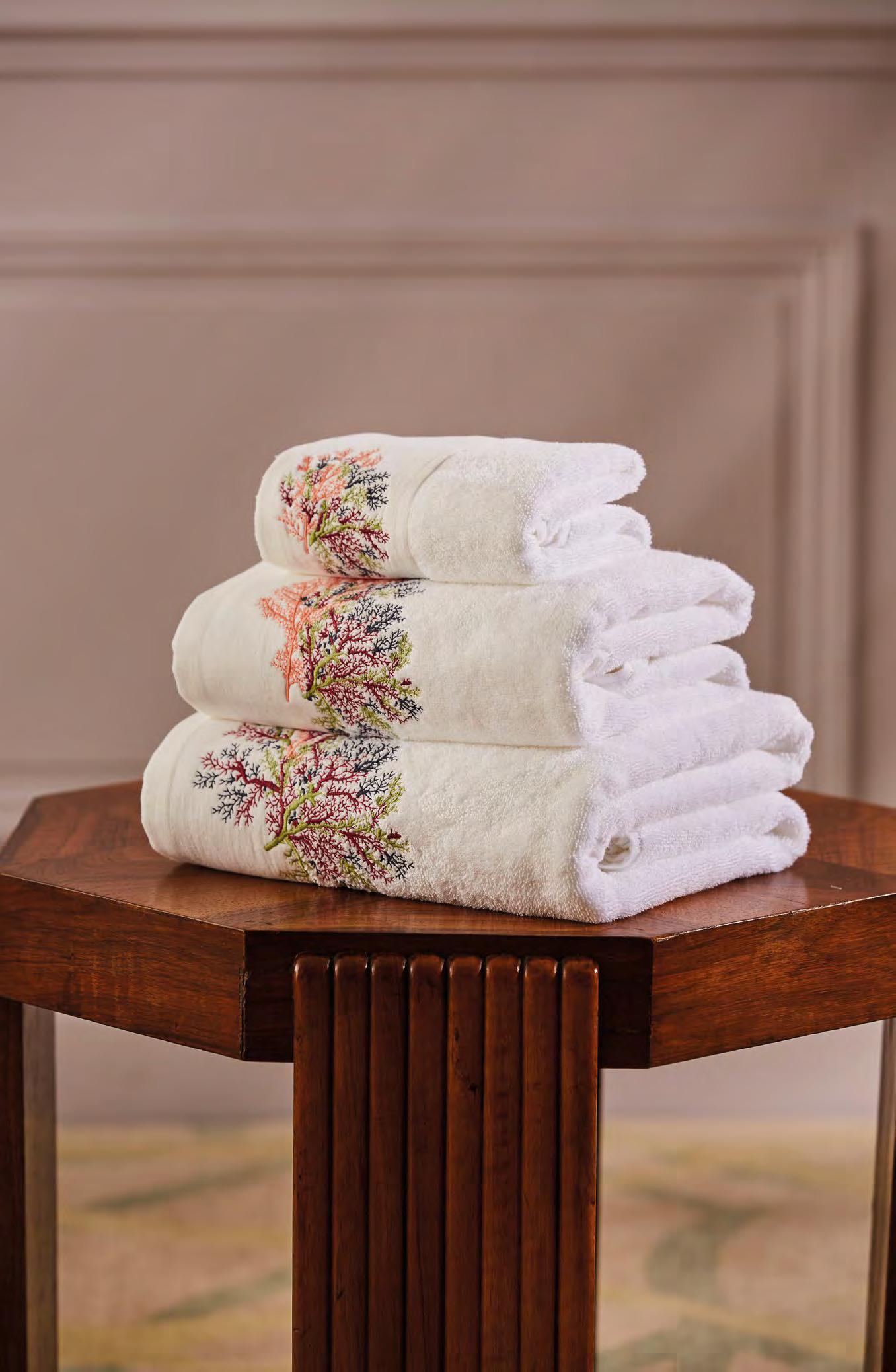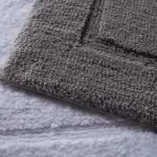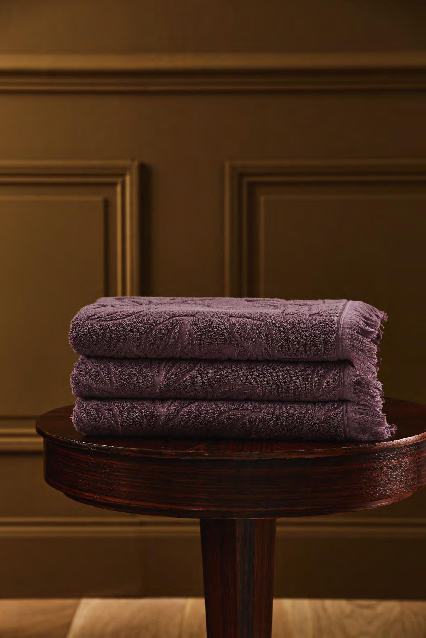 2. Bain Bath Drap de bain 90 × 150 cm, Bath Sheet 35” × 59”, Serviette de douche 70 × 140 cm, Bath Towel 28” × 55”, Serviette 55 × 100 cm, Hand Towel * 22” × 39” , Serviette invité 42 × 70 cm, Guest Towel 17” × 28”. Jacquard bicolore, finition liteau 3 cm haut et bas Passages de fins liteaux colorés.
