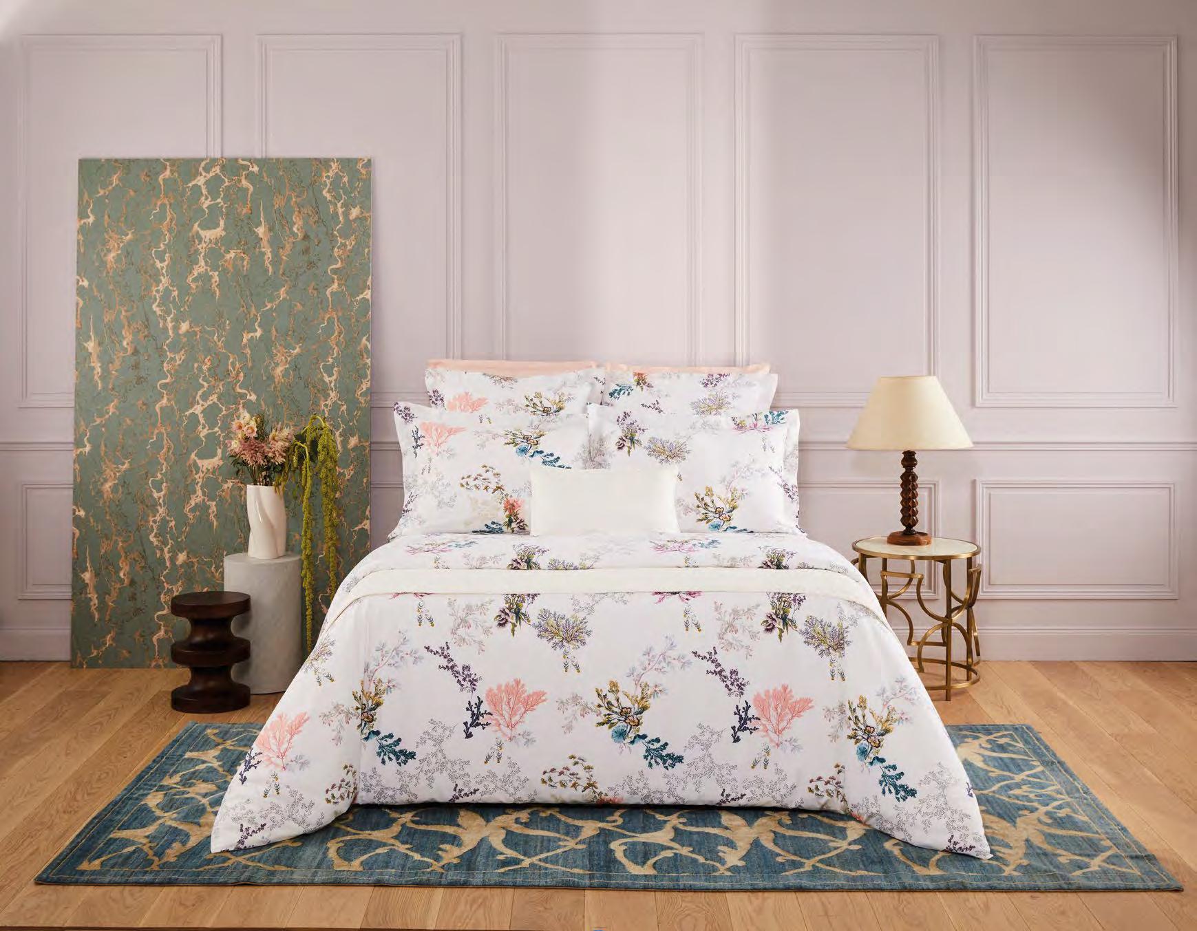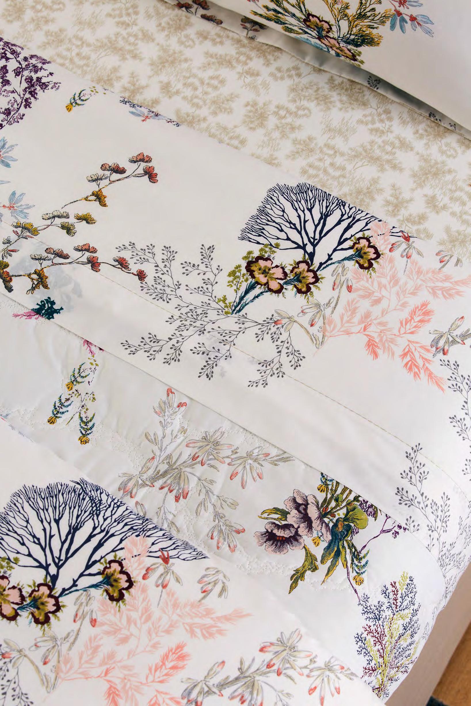 Imprimé, 15 couleurs pour le motif principal, 1 couleur pour le motif coordonné. Housse de couette réversible, fermeture bouteille. Drap plat avec parement appliqué de 10 cm au dos dans le motif coordonné. Drap housse dans la réversibilité du modèle (bonnet 40 cm - convient aux matelas ayant une épaisseur de 35 cm maximum). Taies réversibles avec volant de 5 cm. Finition biais pour le drap plat et les taies.