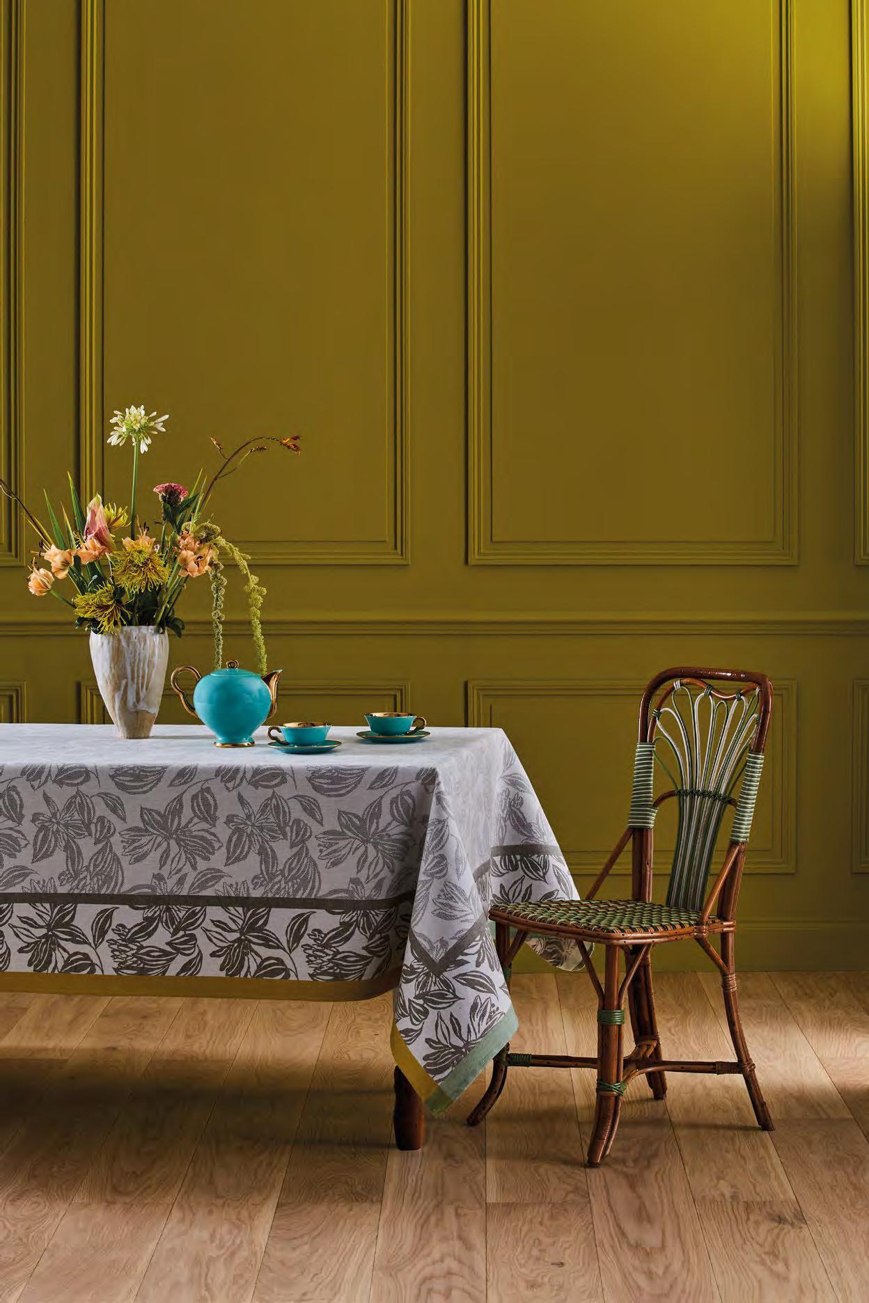 Calme et intriguant sous-bois, refuge protecteur des arbres. Jacquard dans l’air du temps où les feuillages racontent une histoire de tissage délicat en lumière d'or.