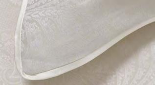 Duvet cover in Jacquard fabric for front side and solid color fabric in Nacre for reverse, button finish. Flat sheet in Nacre plain colour with 5’’ hem in damask fabric finished with piping. Solid color fitted sheet in Nacre. Suitable for mattresses with a maximum thickness of 18''. Reversible sham with 2" flounce and piped finish. Italy