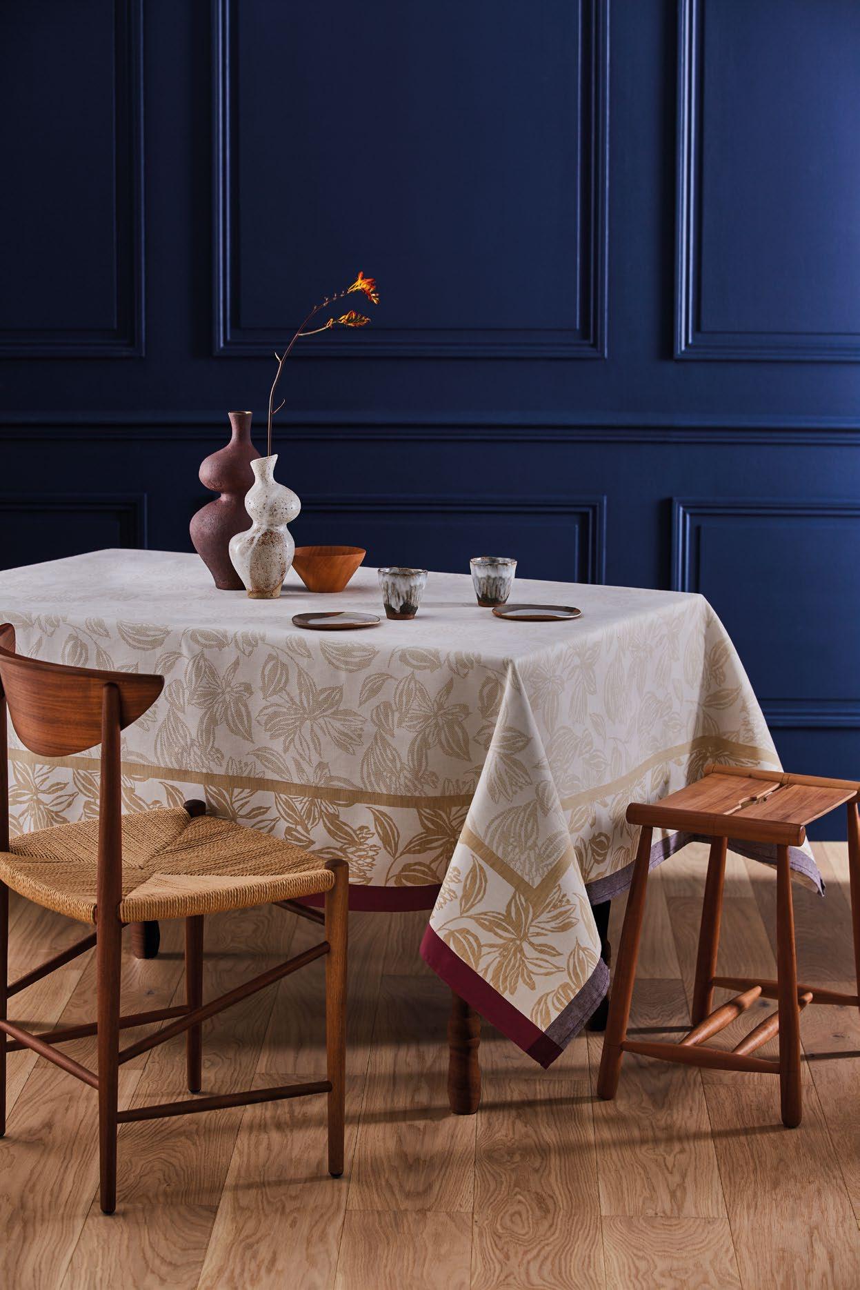 Calme et intriguant sous-bois, refuge protecteur des arbres. Jacquard dans l’air du temps où les feuillages racontent une histoire de tissage délicat en lumière d'or.