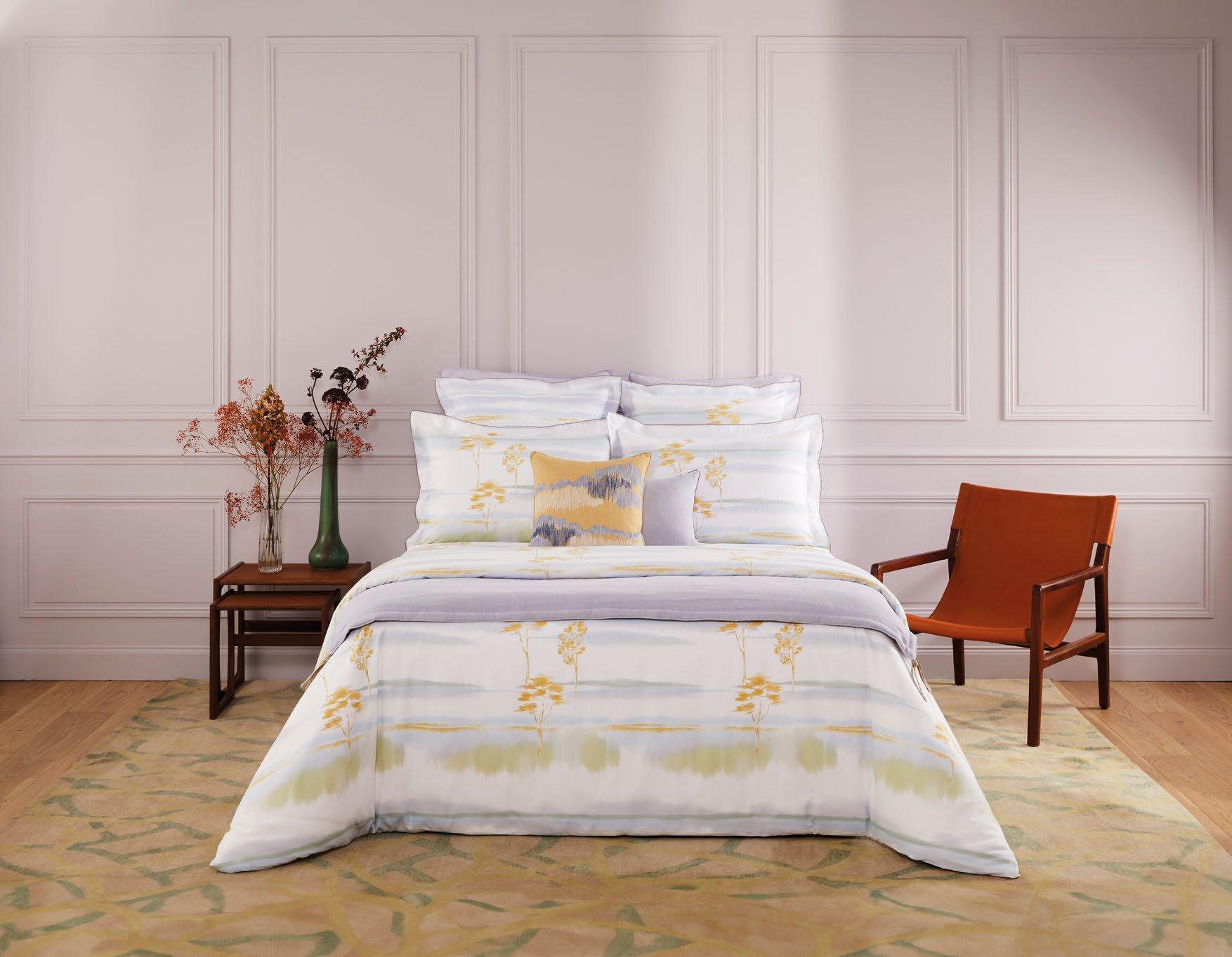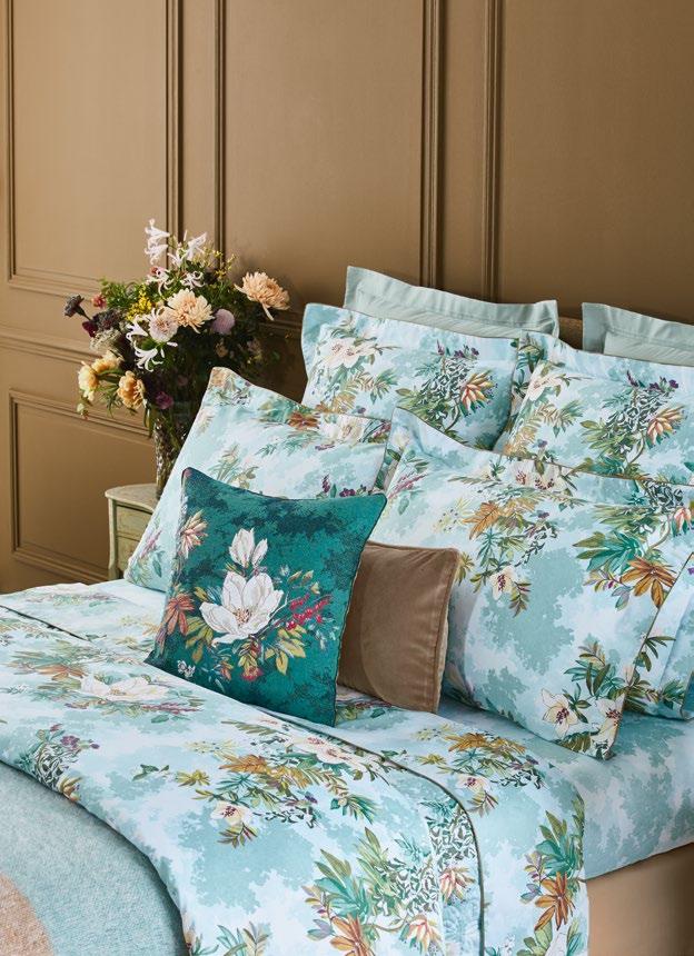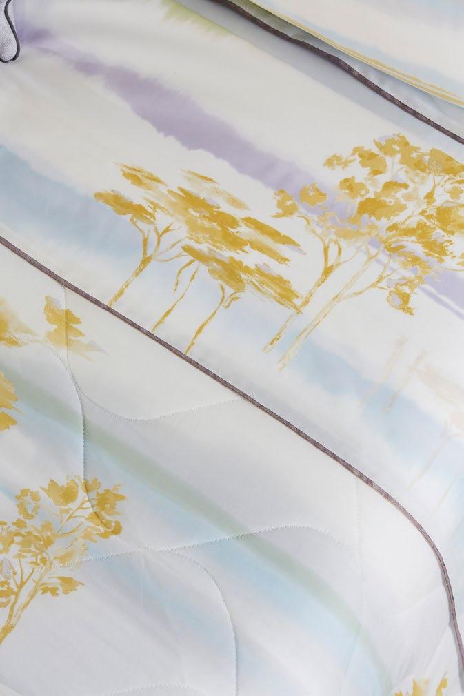 The rustling of wings or leaves. Close your eyes and see the colours flutter like fireflies, in touches of watercolour from green to lilac, on cotton sateen.