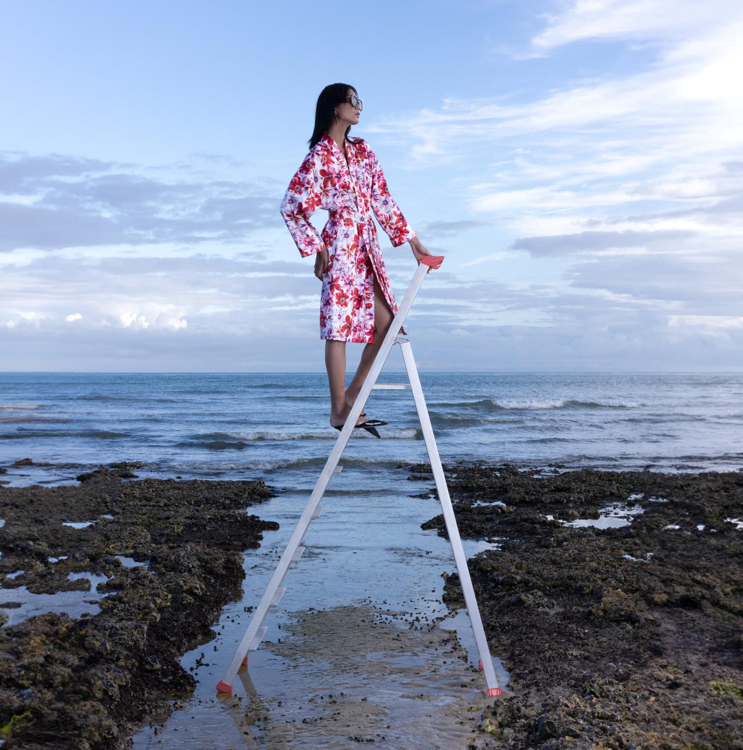 The pattern, from a former Kenzo silk kimono, plays with refined shades of black and white, brightened in areas with touches of powder pink and celadon green. A delicate slubbed micropattern with an interplay of materials completes this tale.
