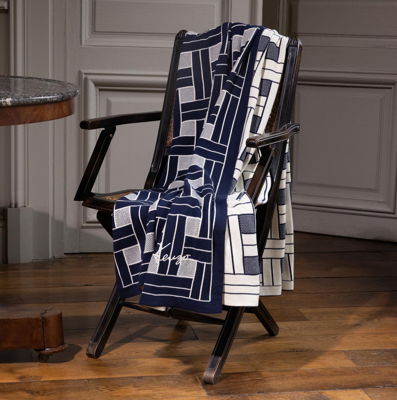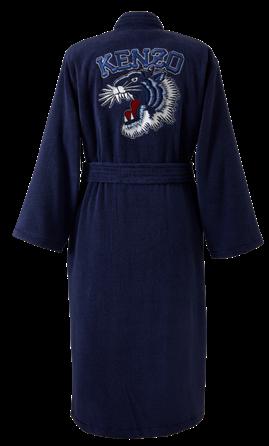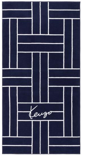 Housse de couette réversible, drap housse, taies 50x75cm et 65x65 cm avec finition passepoil marine et vignette signature KENZO au dos.