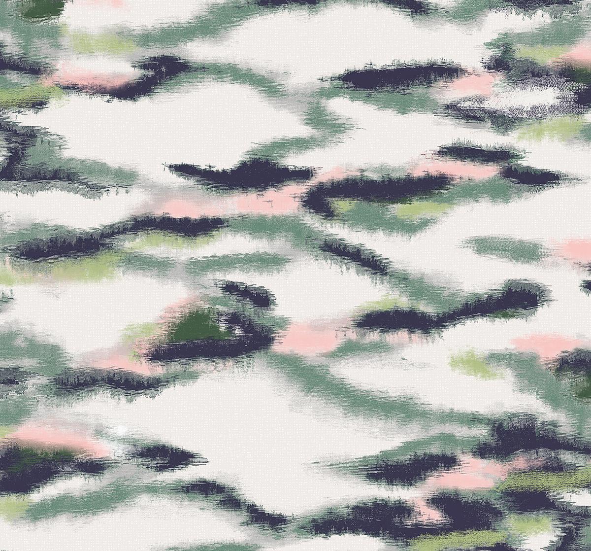 Ce motif, décliné d’un ancien kimono Kenzo en soie, joue avec des dégradés raffinés de noir et blanc, ponctuellement animés de touches rose poudré et vert céladon. Un délicat micro-motif granité avec son jeu de matière, complète cette histoire.
