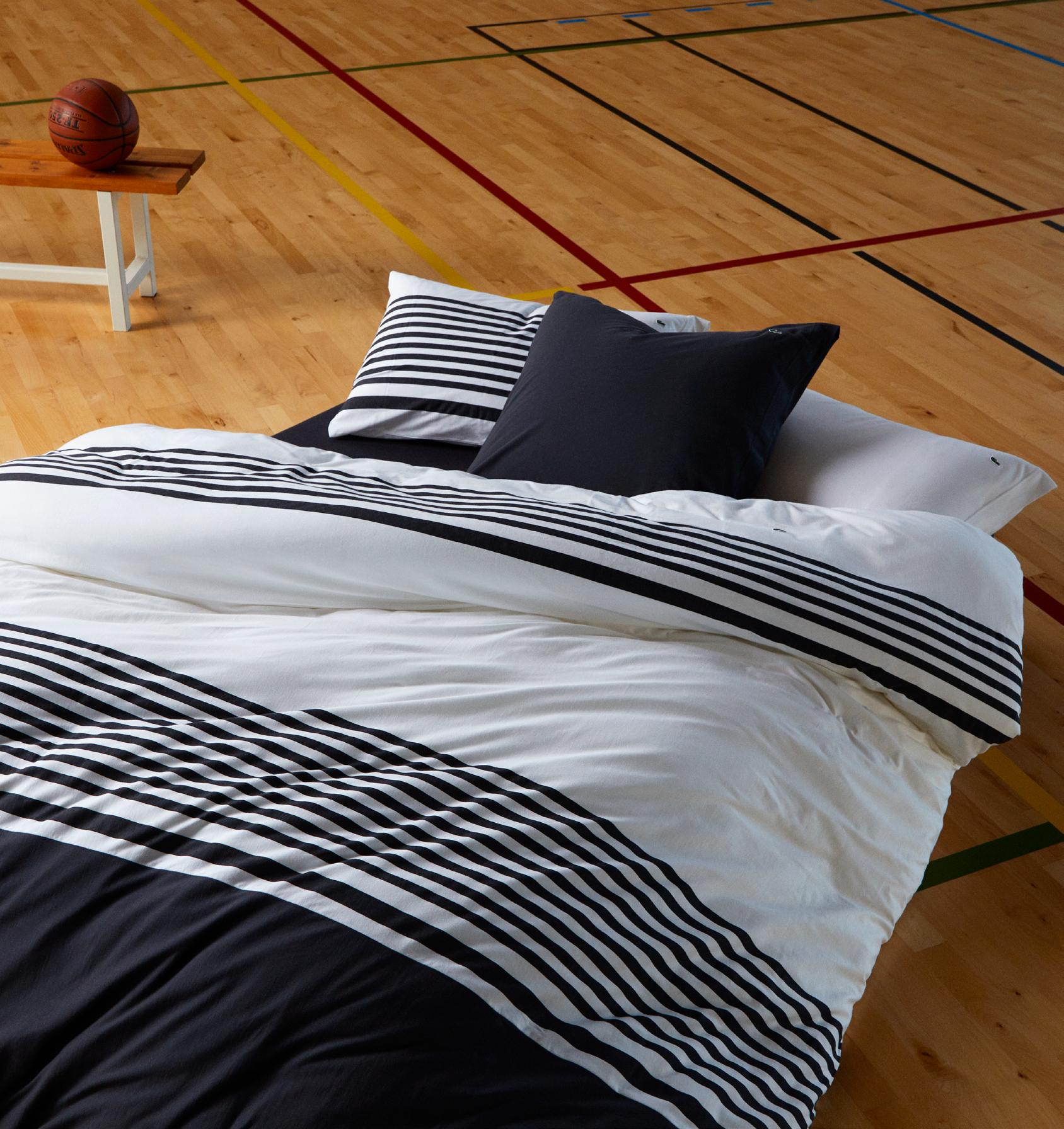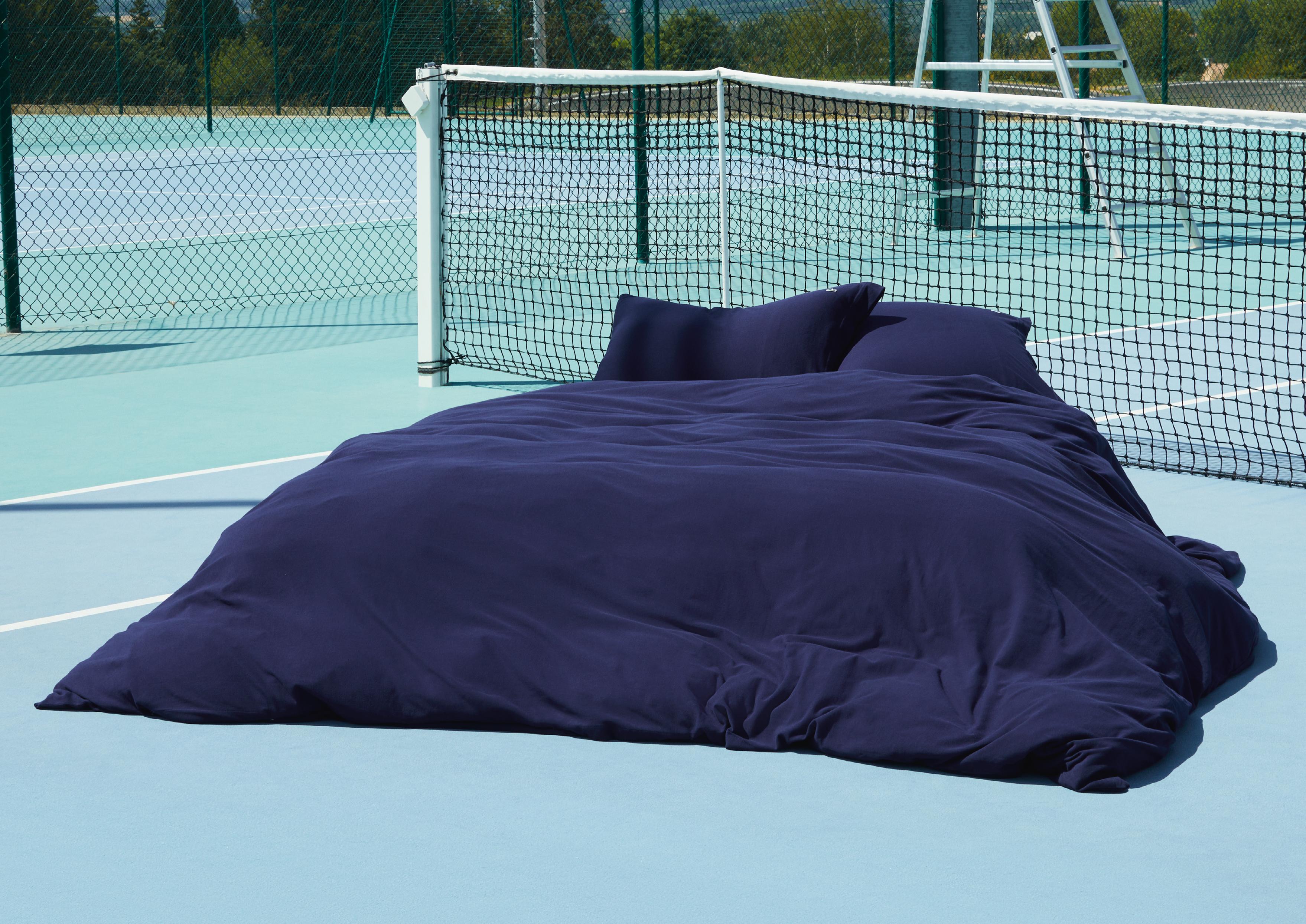 A timeless design playing on the impact of a tennis-ball trajectory. On superb cotton sateen, the brushed effect emphasises the faux-solid formed by multiple irregular stripes.
