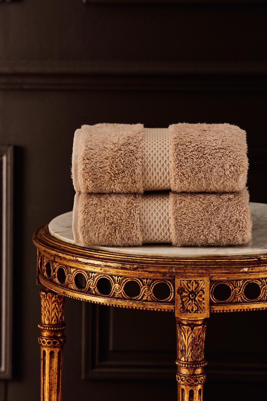 1.Peignoir Givre Bathrobe Givre. / 2. Linge de lit Adagio Camel Bed Linens Adagio Camel /