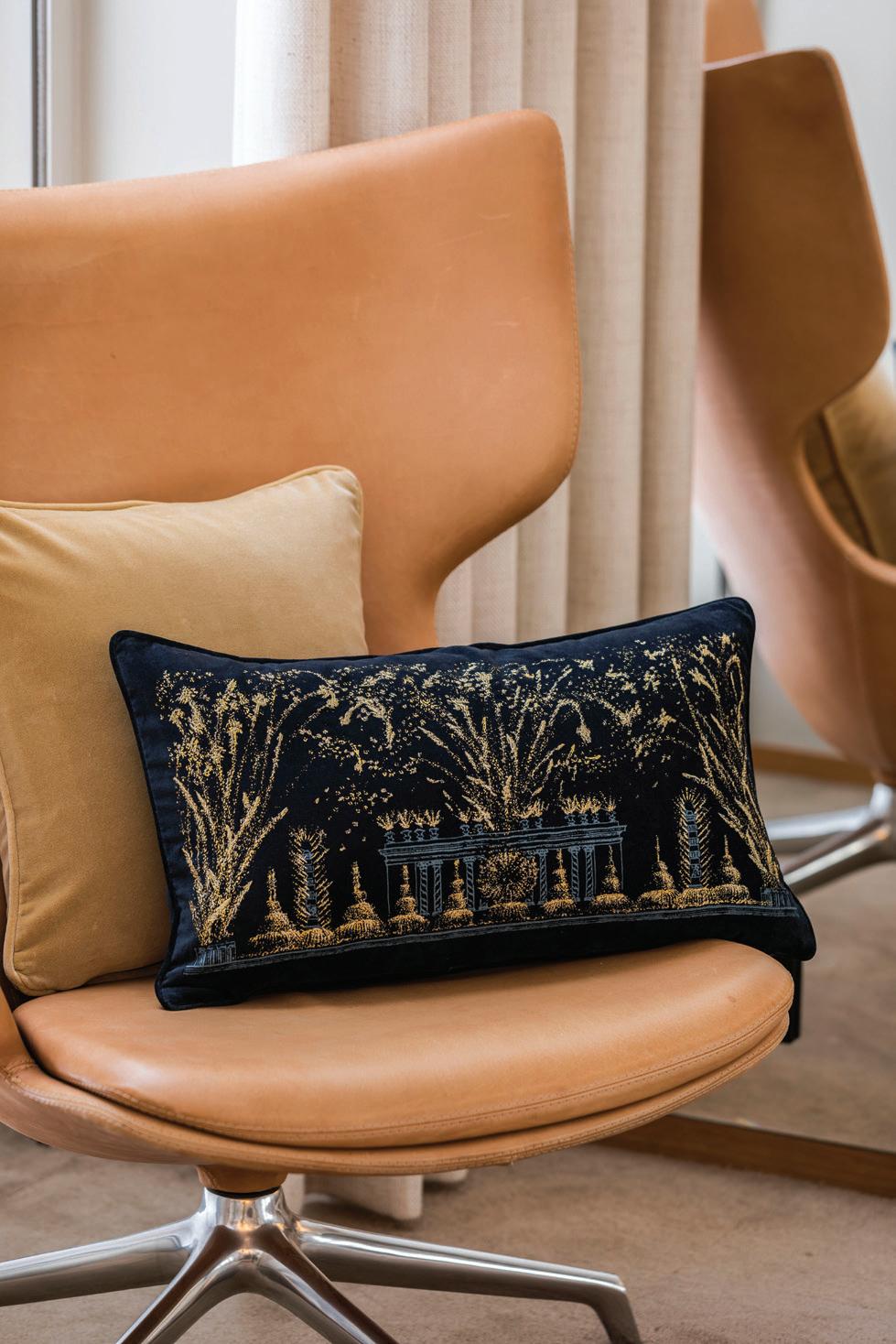 dressing gown in Pierre colored striped cotton poplin by Laurence Tavernier. /3. Living room space with decorative cushions in warm tones by Yves Delorme Decoration. / 4. In the reading room, Pigment linen decorative cushions blend with deep velours by Yves Delorme Decoration and nestle on the Joyau cashmere throw blanket by Yves Delorme Couture.