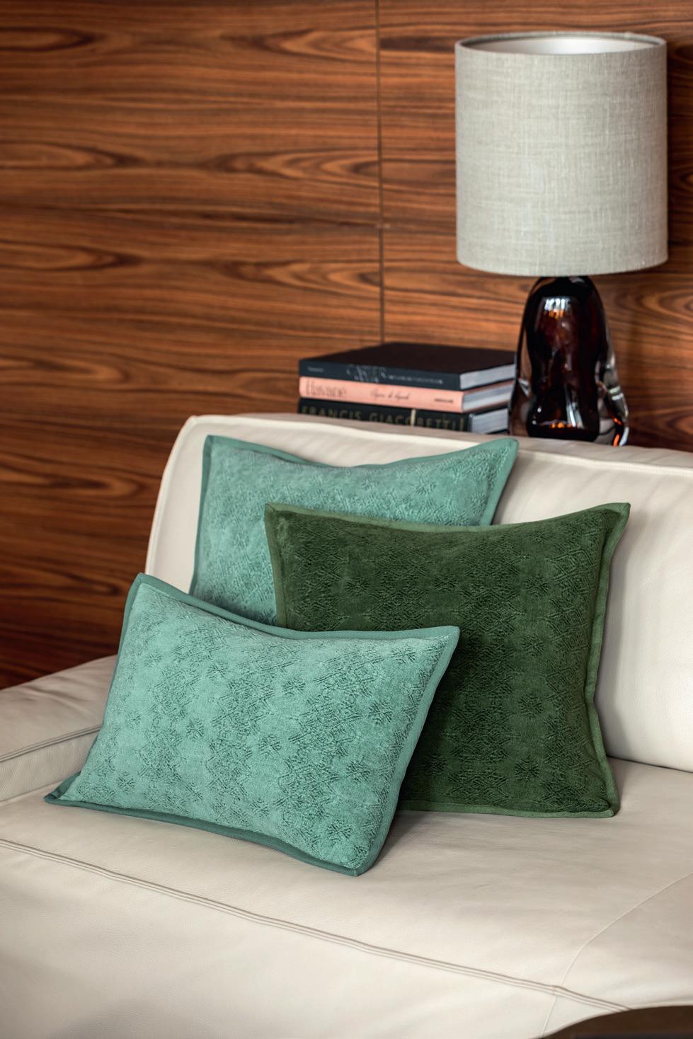 Panorama / 2. Housses de coussin décorative Syracuse Mousse et Kaki. Decorative Pillows Syracuse Mousse and Kaki / 3. Housses de coussin décorative Fresque Tilleul & Divan et Kaki.