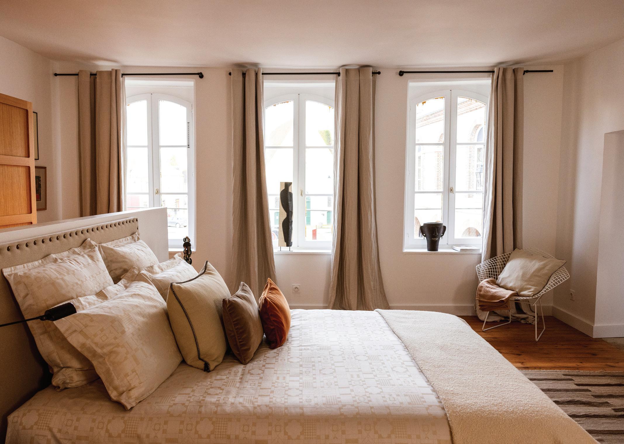 Master Bedroom with Allure bed linens in damask sateen by Yves Delorme. Divan velours Decorative Cushions & Bouclette