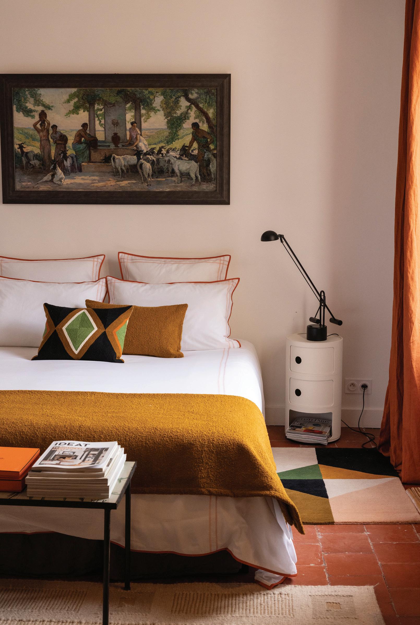 1. Sophie porte un pyjama rayé en satin de soie Simone de Laurence Tavernier. / 2. Chambre d’amis avec parure, Interlude Yves Delorme Couture avec passepoil en satin et double point d’ombre en couleur sur-mesure, orange. Coussin décoratif & chemin de lit, Bouclette Yves Delorme Decoration.