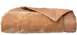 Courtepointe en lin, rembourrée. Face en lin coloré, dos en lin naturel. FInition noeuds aux quatre coins. Face et dos 100% lin.