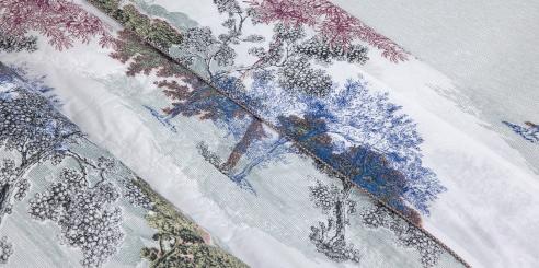 As on a Toile de Jouy, live oak, stone pine and black walnut are ink-drawn and printed on batiste cotton. A model in tune with the times, in chic and vegetal shades.