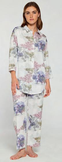 Comme une toile de Jouy, chêne vert, pin parasol, noyer noir sont dessinés à la plume et imprimés sur batiste de coton. Un modèle dans l’air du temps, en nuances chics et végétales.